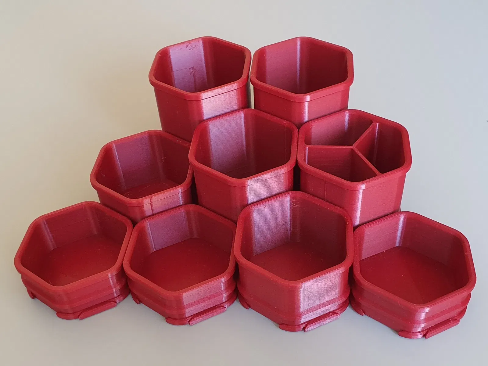 [Cập nhật 2: Thêm các biến thể cao hơn (120 mm và 150 mm) theo yêu cầu của người dùng.] [Cập nhật: Thêm nhiều thiết kế phân đoạn hơn.] ### Điều này là gì Con gái tôi thích vẽ. Nhưng mỗi khi cô ấy vẽ, phòng của cô ấy trở thành một mớ hỗn độn vì cô ấy ghét việc đặt hàng triệu cây bút và màu của mình trở lại vào túi và hộp nơi cô ấy giữ chúng. Vì vậy, để làm cho cuộc sống của cô ấy dễ dàng hơn một chút, tôi đã làm cho cô ấy một giá đỡ bàn có thể mở rộng cùng với bộ sưu tập bút và dụng cụ thủ công ngày càng tăng của cô ấy. Giá đỡ bao gồm nhiều phần với kích thước khác nhau có thể dễ dàng kết nối theo bất kỳ thứ tự nào. Kết nối rất chặt chẽ và ổn định, vì vậy, một khi được lắp ráp, giá đỡ cảm giác như một khối duy nhất và có thể dễ dàng di chuyển xung quanh. Trọng lượng và thời gian in thay đổi và phụ thuộc vào phần thực tế được in (2h đến 5h, 23g đến 53g). ### Cách lắp ráp và tháo rời Điều này hoạt động tương tự như cách các mảnh ghép của trò chơi ghép hình khớp với nhau: - Trên một bề mặt phẳng, đặt hai mảnh cạnh nhau, một trong số đó hơi nâng lên, để các phần kết nối chạm vào nhau và một đầu nối nằm trên đầu kia.