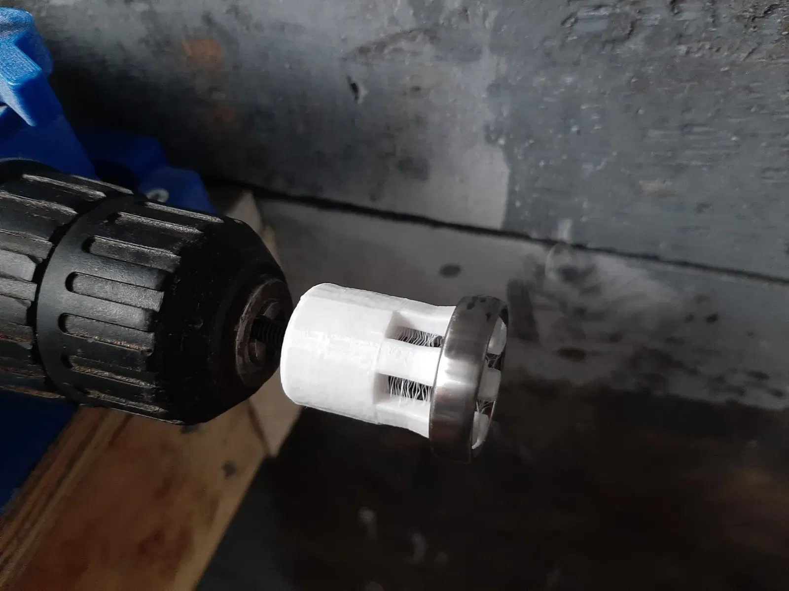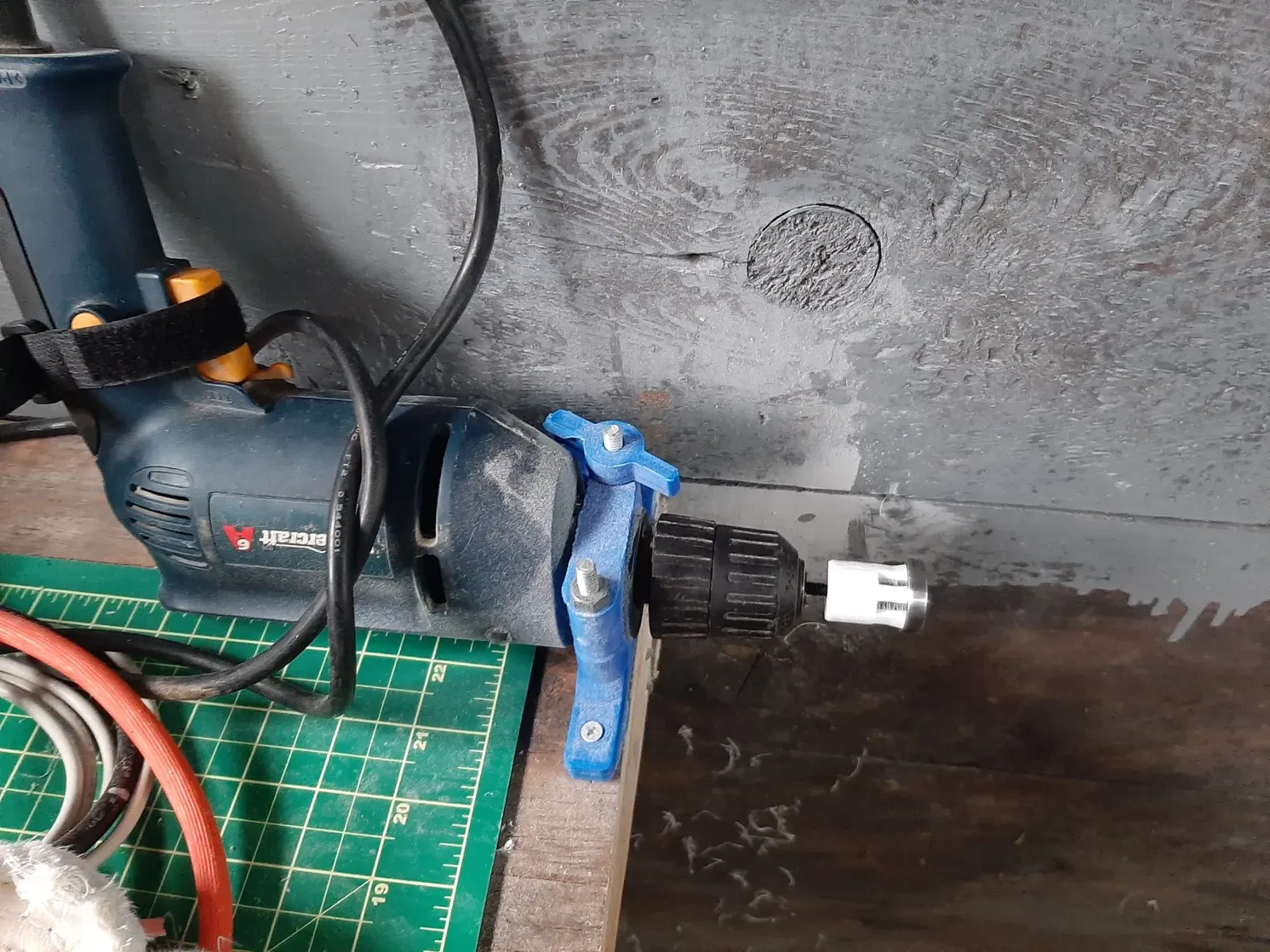 một con ốc M5 đi qua giữa và được giữ trong mâm cặp khoan.