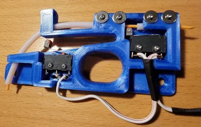- Thêm một kẹp cho ống PTFE/Bowden để cấp filament ngay đến cạnh của công tắc con lăn trên cùng để căn chỉnh đáng tin cậy hơn.