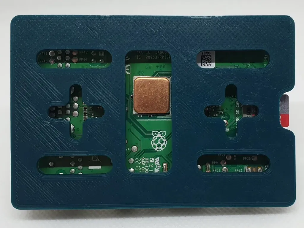 Không cần phần cứng bổ sung; Pi được giữ chặt bởi 3 kẹp. Phiên bản Pi 5 có một kẹp ở vị trí hơi khác, tuy nhiên vẫn nên tương thích với các mẫu trước đó.