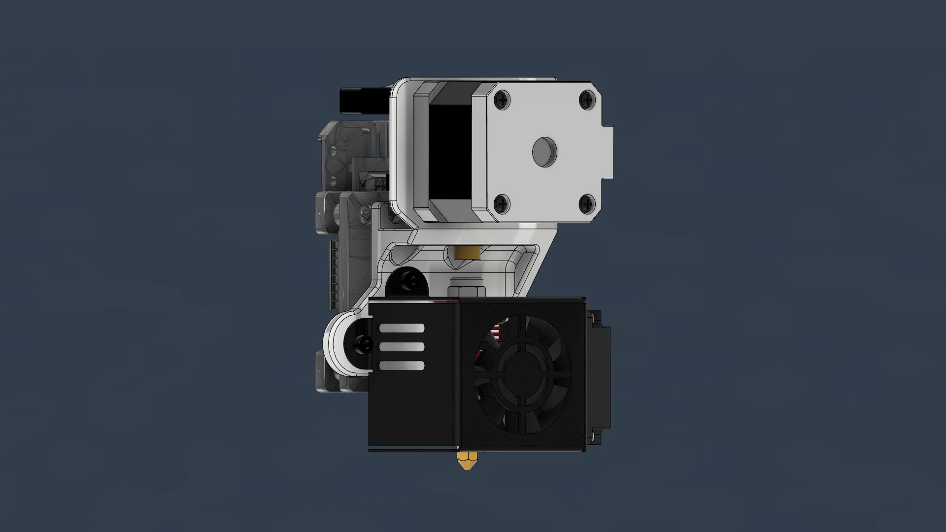 Nó sử dụng các lỗ gắn tiêu chuẩn của bộ tản nhiệt đầu nóng để gắn phần in 3D vào bảng cua, với các khe vít/nut tùy chọn bên cạnh bộ đùn. Để giữ cho cụm này gọn gàng, động cơ bước hướng vào trong, điều này phần nào hạn chế truy cập vào bộ đùn, nhưng vẫn có thể truy cập được vào vít điều chỉnh độ căng và cần gạt ngắt.