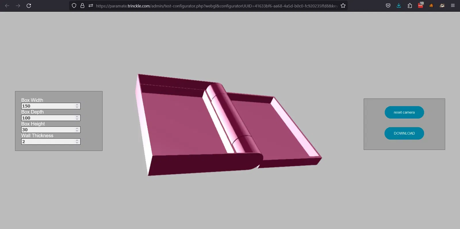 trình tùy chỉnh trực tuyến: https://paramate.trinckle.com/admin/test-configurator.php?webgl&configuratorUUID=41633bf6-aa68-4a5d-b0c0-fc920235ffd8&key=26541e7e7c8b7198338c7737610aa1d7