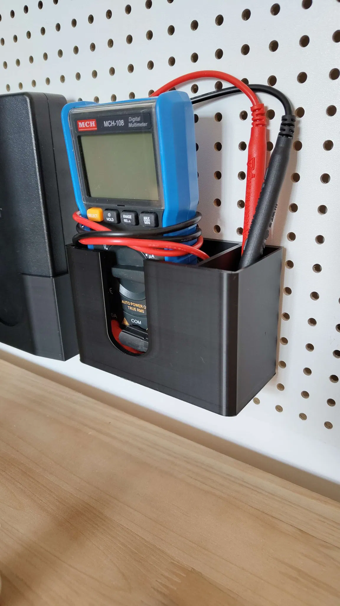 Remix của giá treo đồng hồ vạn năng bởi @Shabubu. Nó hoạt động với các bảng pegboard theo hệ mét có khoảng cách 1.5cm và lỗ 4-5mm.