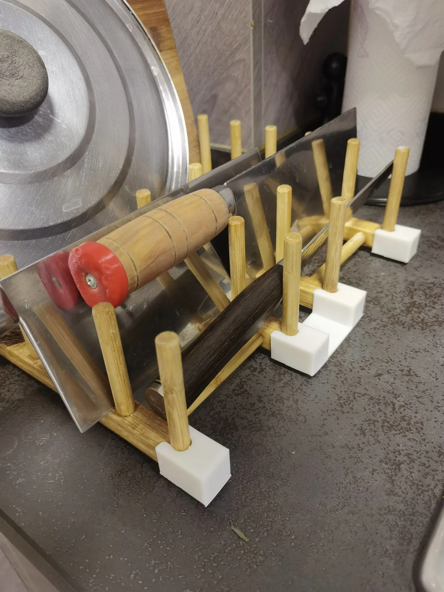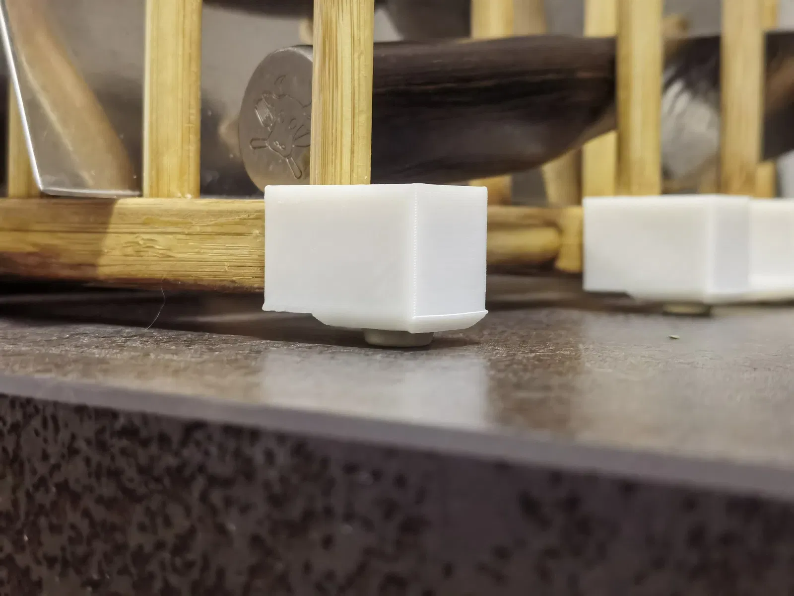 Tôi đã đặt hai giá đỡ đĩa IKEA OSTBIT cạnh bếp của mình, và tôi đang tìm cách cải thiện độ ổn định của chúng. Để đạt được điều này, tôi đã thiết kế một sự điều chỉnh sử dụng chân cao su có đường kính 15mm, hoàn toàn phù hợp với chân 13mm của các giá đỡ đĩa.