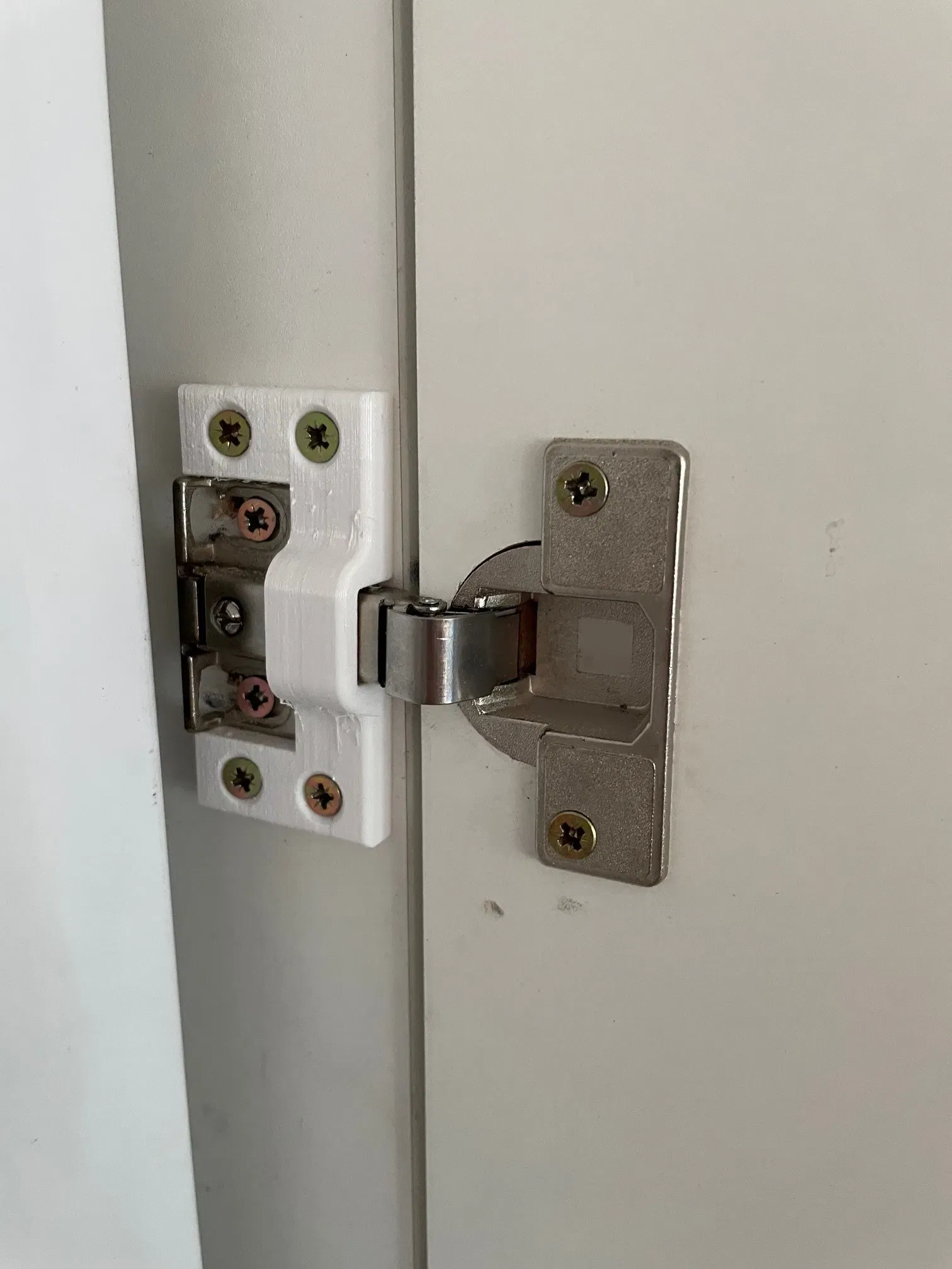 Bản lề của tủ lạnh của chúng tôi đã hoàn toàn mòn và không còn giữ được vị trí. Miếng vá này có thể được gắn lên trên bản lề thực tế bằng bốn vít gỗ.
