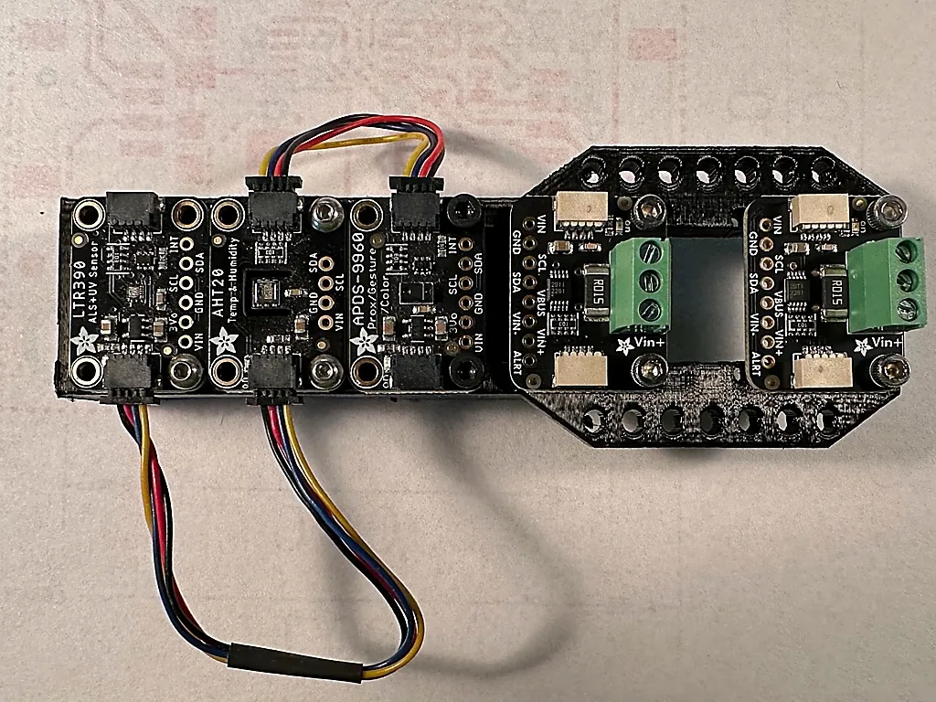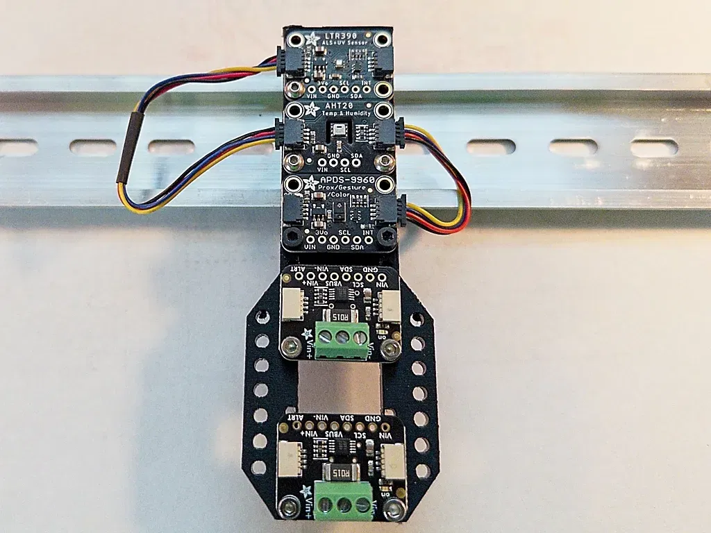 Một giá treo đường ray DIN cho tối đa năm mô -đun QWIIC Adafruit sử dụng ốc vít M2.5.