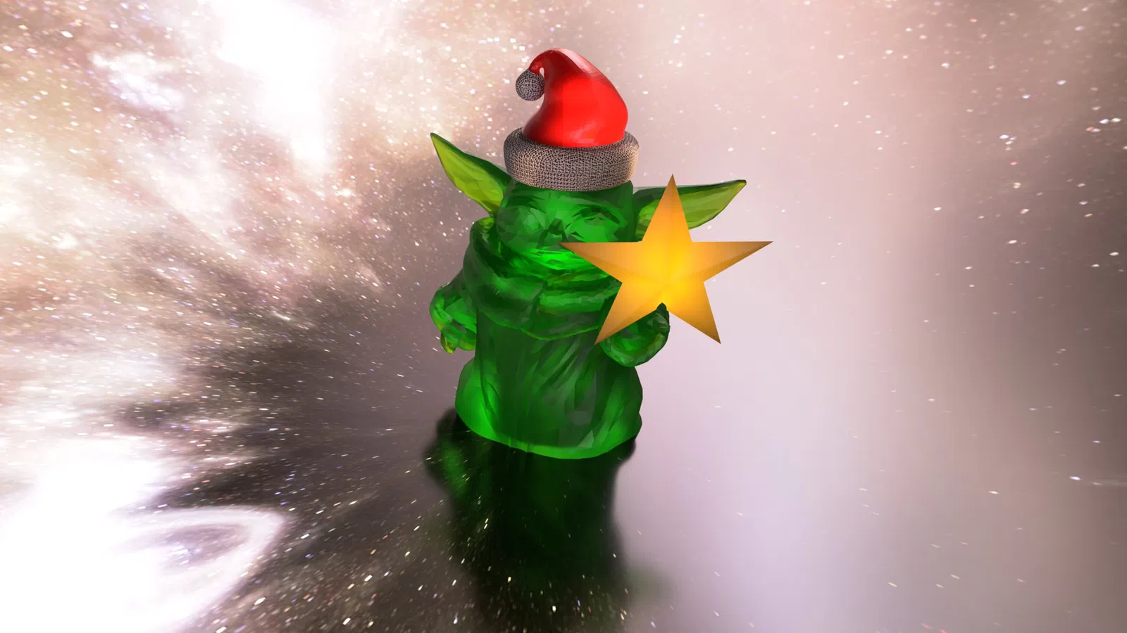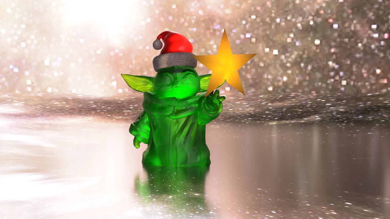 Grogu levitating Christmas star tree topper. Có sẵn với và không có mũ Giáng sinh. Sử dụng đèn Giáng sinh hiện có của bạn để chiếu sáng Grogu và ngôi sao