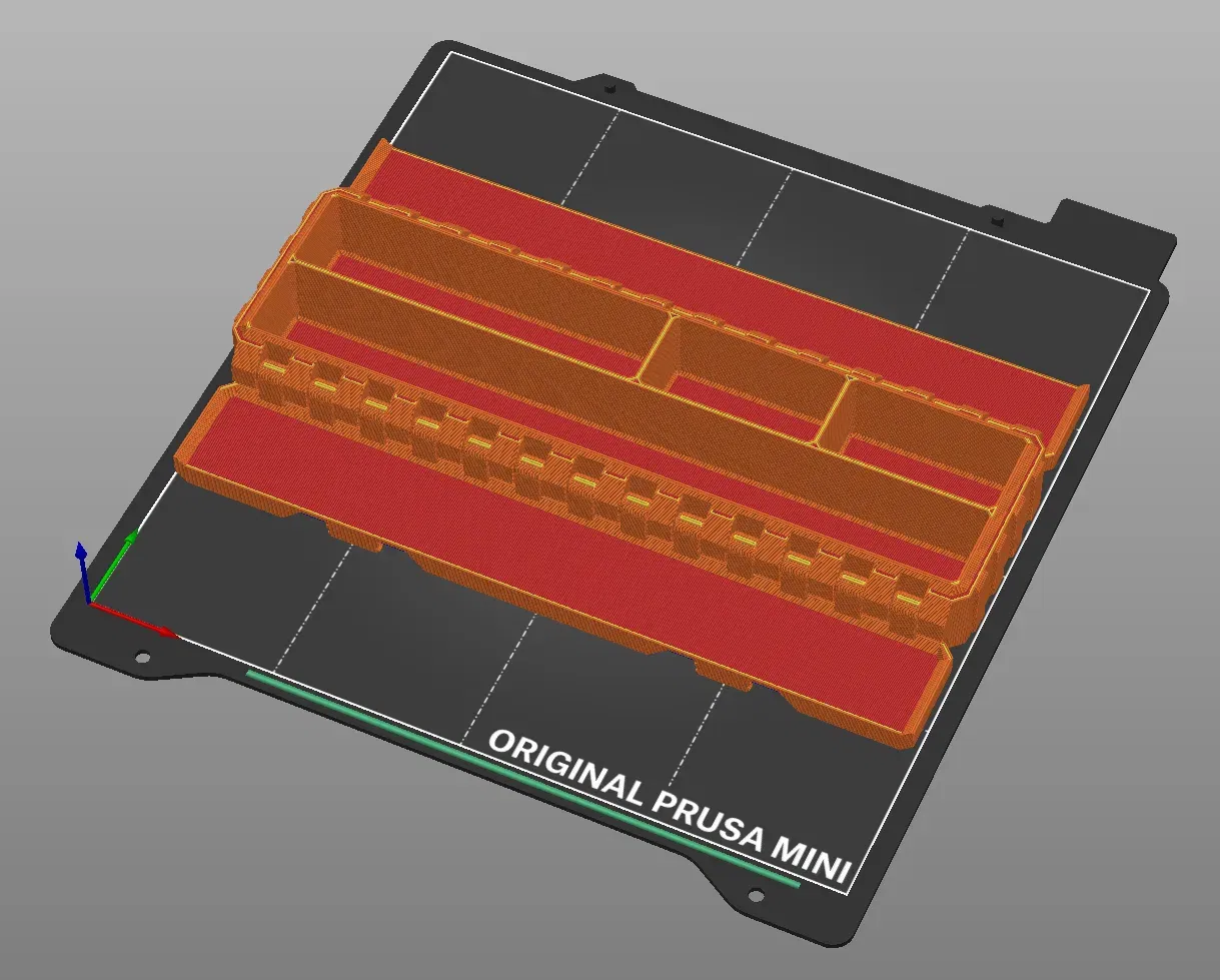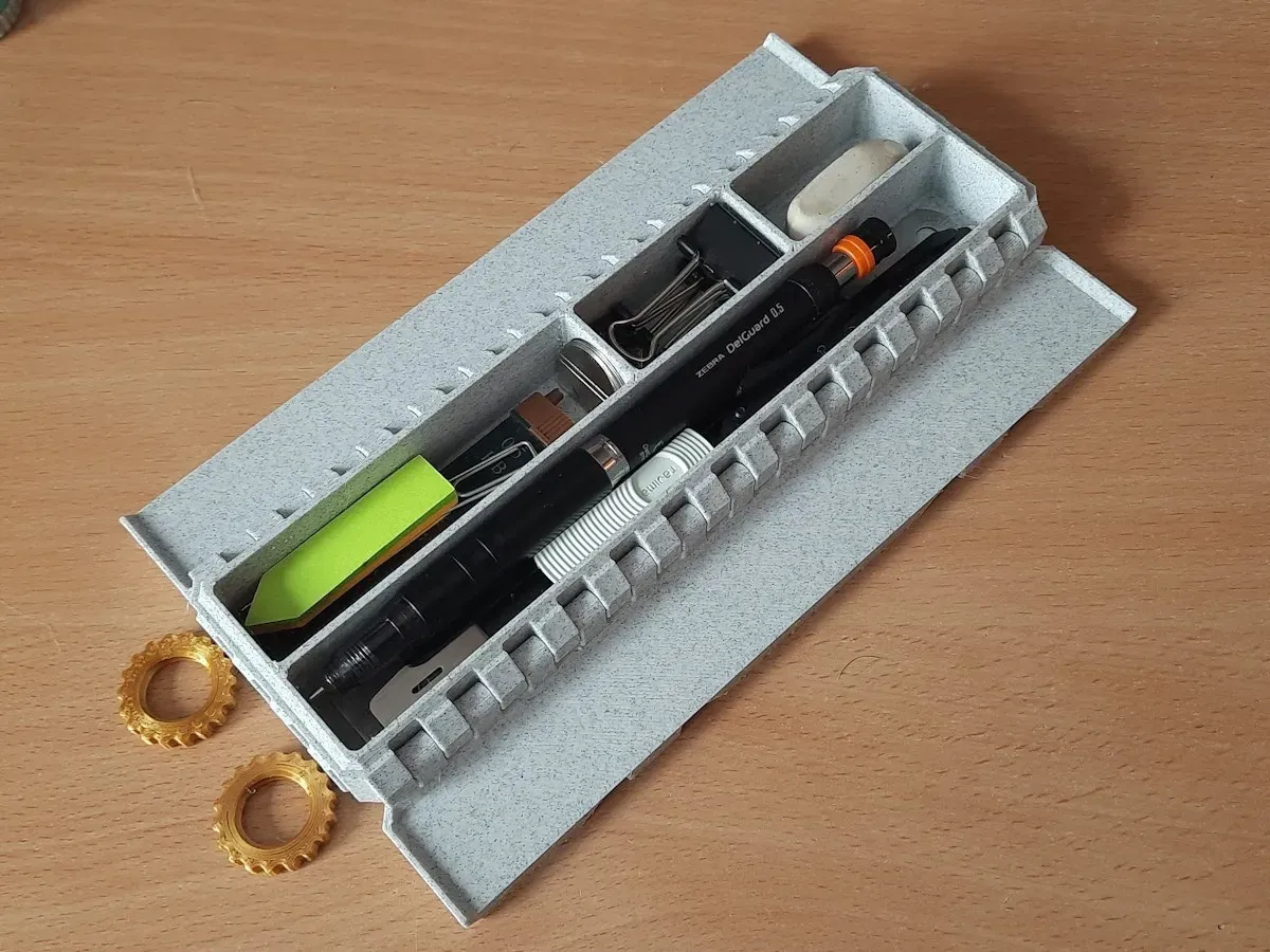 Vì tôi vừa thiết kế Vault Crate, tôi nghĩ rằng một hộp bút có thể là một ứng dụng tốt cho nó, đã điều chỉnh kích thước để vừa với hầu hết bút/chì và thậm chí một thước kẻ ngắn (17cm chiều dài bên trong) và thêm một số ngăn/chia. Và đã thêm một ổ khóa thứ hai để tăng cường an toàn (hoặc chỉ để đẹp hơn…). Nó cũng vừa vặn với chiếc Prusa Mini đáng tin cậy của tôi (không có chân).