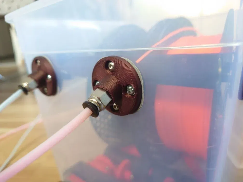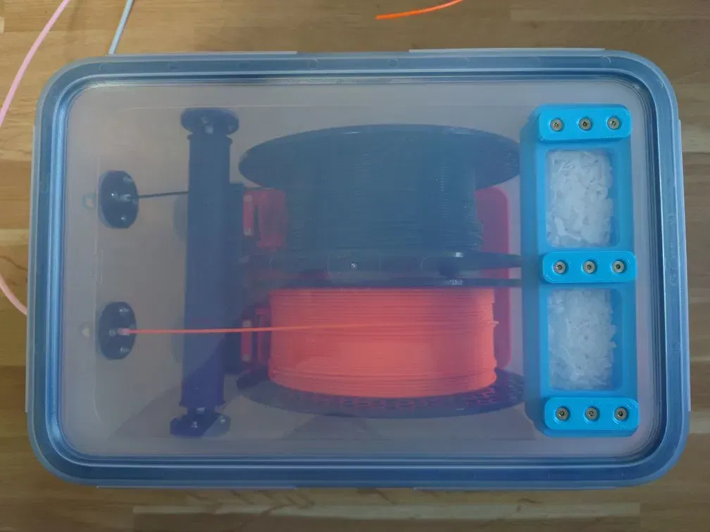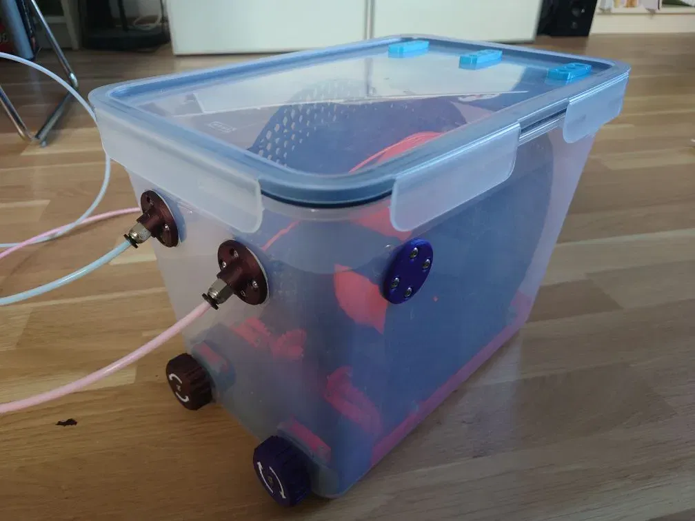 Tôi đang tìm kiếm một giải pháp cho một hộp khô filament nơi tôi cũng có thể cuộn lại các cuộn dây. Giải pháp tốt nhất cho một hộp dường như là hộp IKEA 365+ 10.6l vì sự sẵn có. Vì loại hộp này sẽ chứa 2 cuộn filament và tôi muốn chuyển đổi chúng độc lập với nhau, tôi đã tìm kiếm một giải pháp nơi cuộn filament ngồi trên hai cuộn, thay vì treo trên một thanh chung ở lỗ giữa.