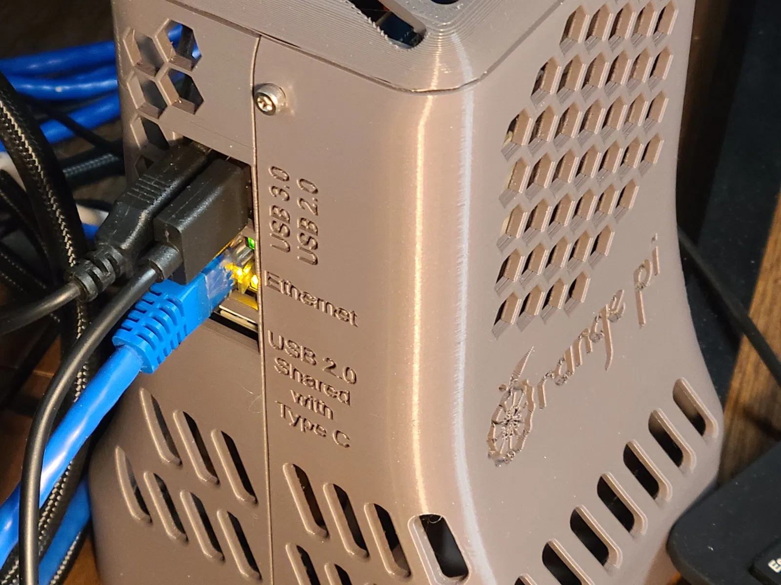 Trường hợp cho PI 5 màu cam được gắn theo chiều dọc, với khoảng trống cho cáp thoát ra ngoài, dự định sử dụng máy tính để bàn