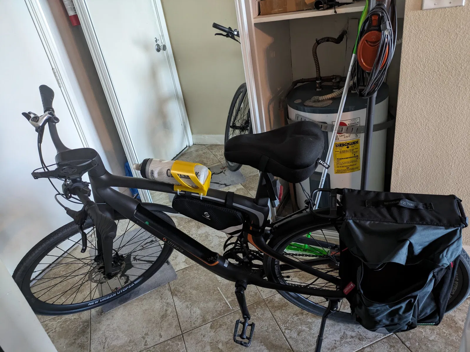 Đi xe đạp mới của tôi, tôi không thể dễ dàng đến được chai nước của mình. Gắn với 2 dây kéo và miếng đệm nhỏ dưới lồng.