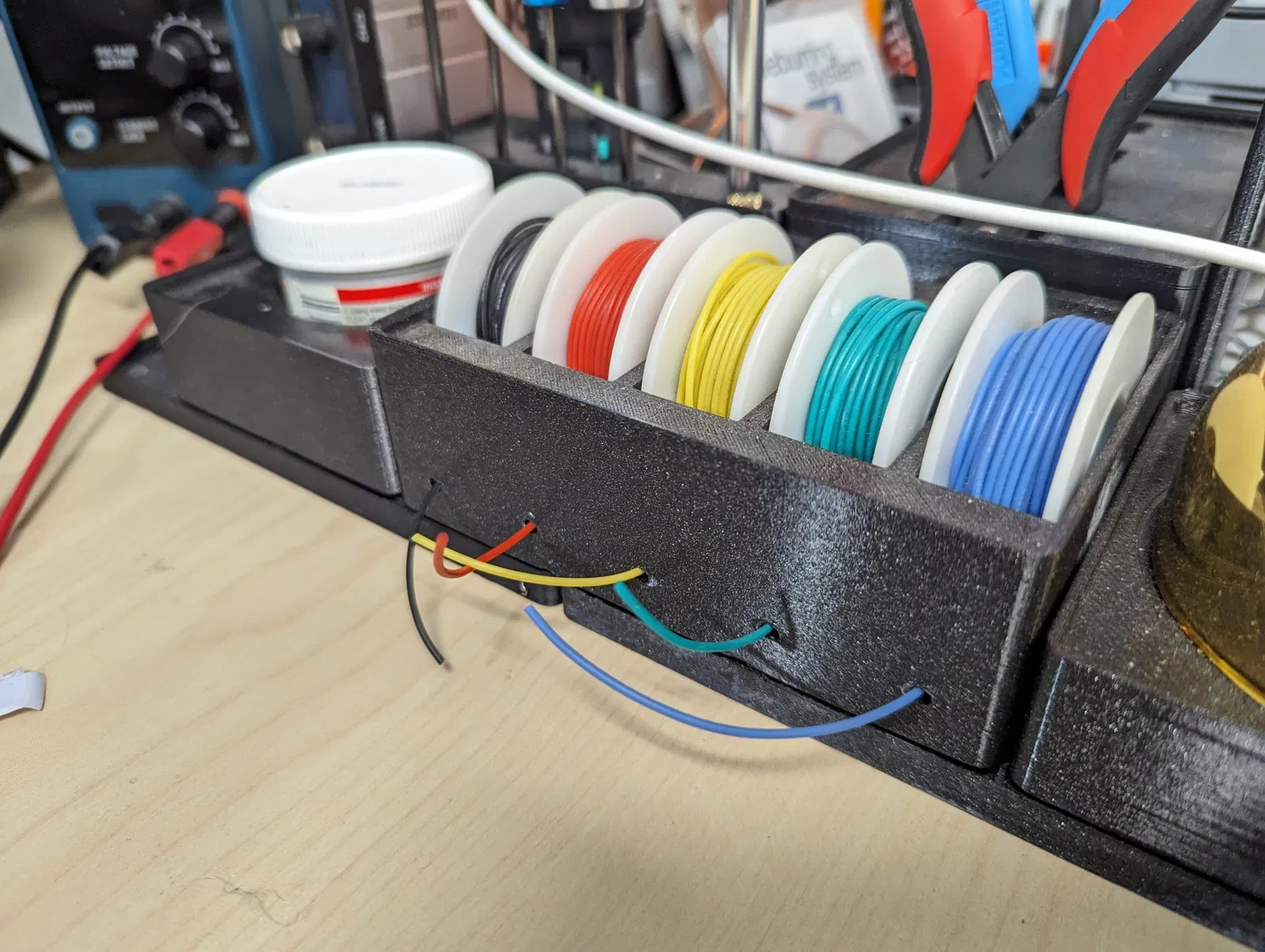 Luồn dây của bạn (hoặc bất cứ thứ gì) qua lỗ và chỉ cần kéo ra khi bạn cần. Tôi thấy điều này dễ in và sử dụng hơn so với giá cuộn với trục.