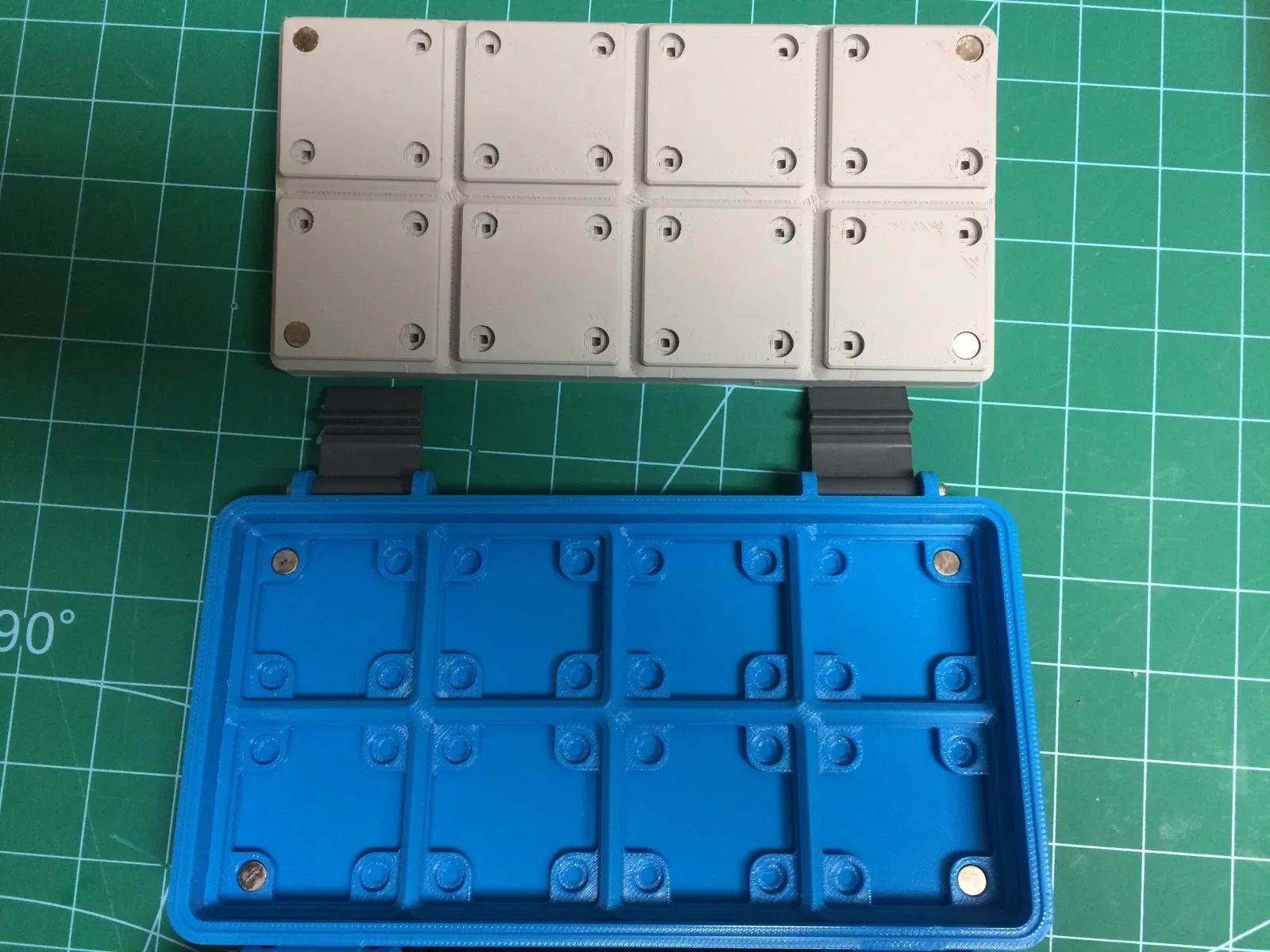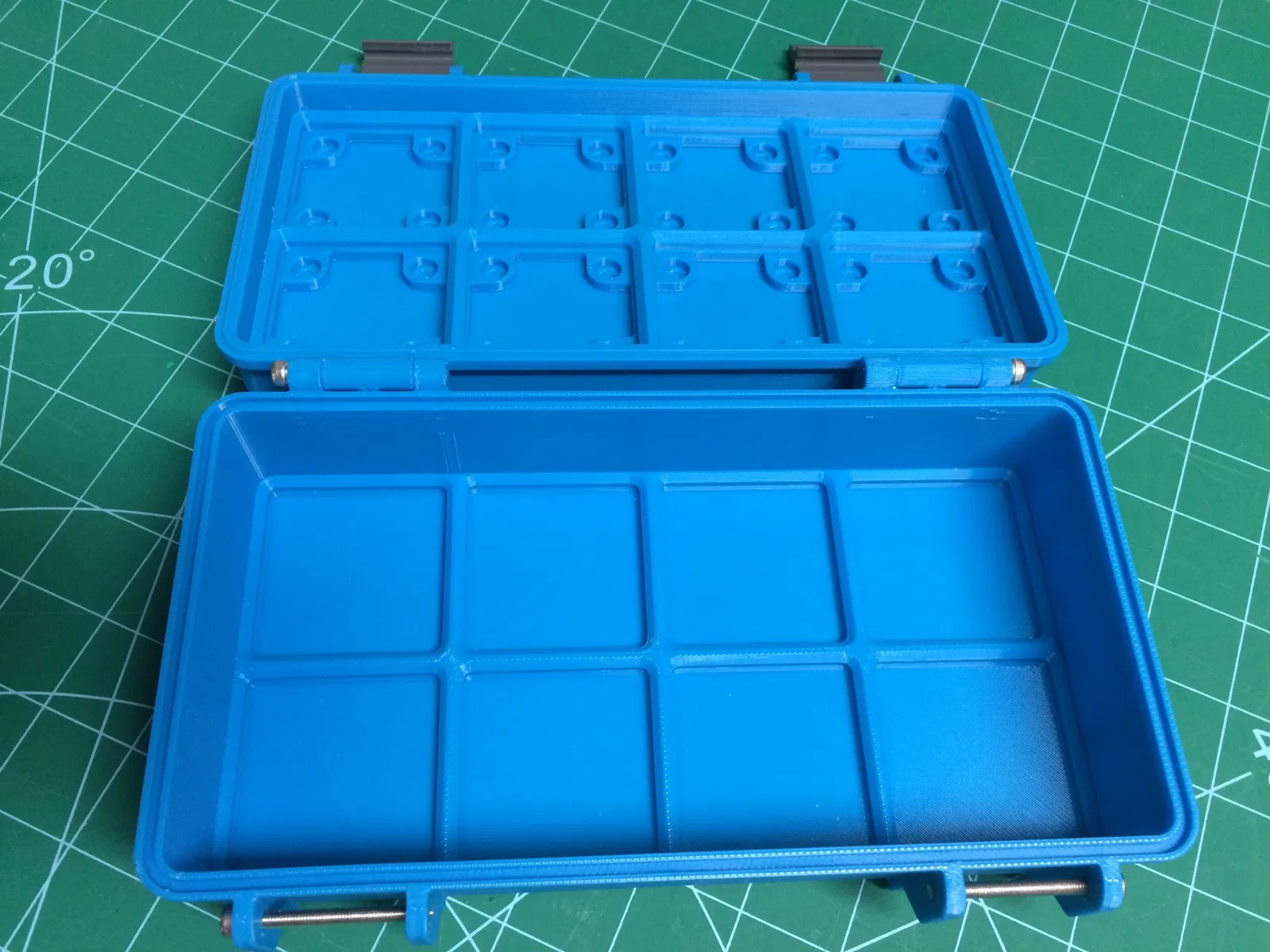Một hộp công cụ tuân thủ Gridfinity với các chèn thiết kế tùy chỉnh để lưu trữ tay cầm Shaviv classic A với giá đỡ/trục lưỡi cắt B cùng với giá đỡ/trục lưỡi khoét F và hai lưỡi khoét (F12 và F20 trong trường hợp của tôi). Các khe cắm công cụ vừa khít nhưng cũng cho phép dễ dàng lấy công cụ ra. Bảng đế đèn nam châm Gridfinity 2x4 được in riêng và được ép vào nắp (bạn có thể phải mài/cắt một chút các cạnh để có sự vừa vặn lý tưởng). Chèn tùy chỉnh cho nắp được giữ bằng nam châm 6x2mm. Các bản lề và chốt yêu cầu 6 vít đầu lục M3x30.