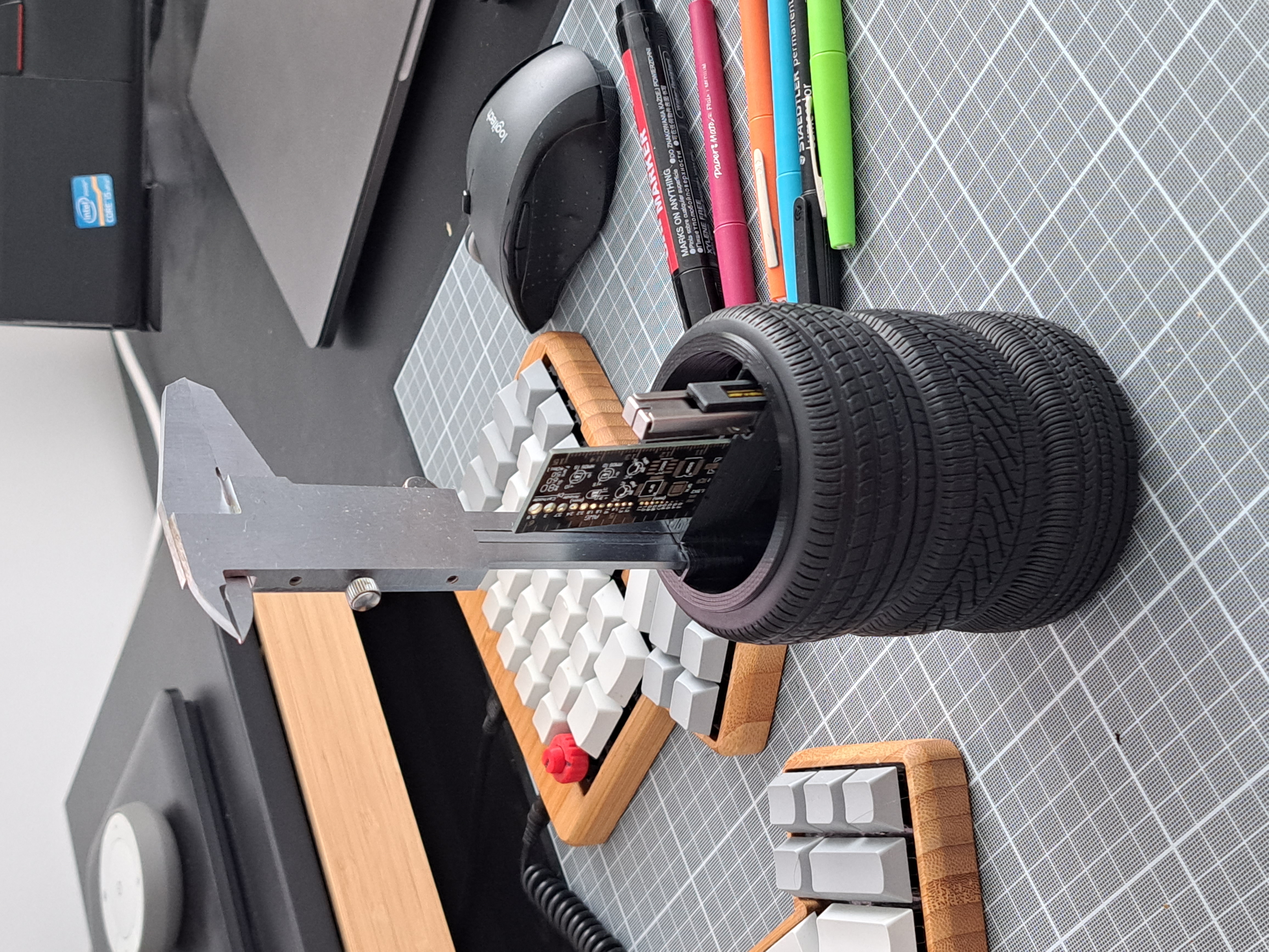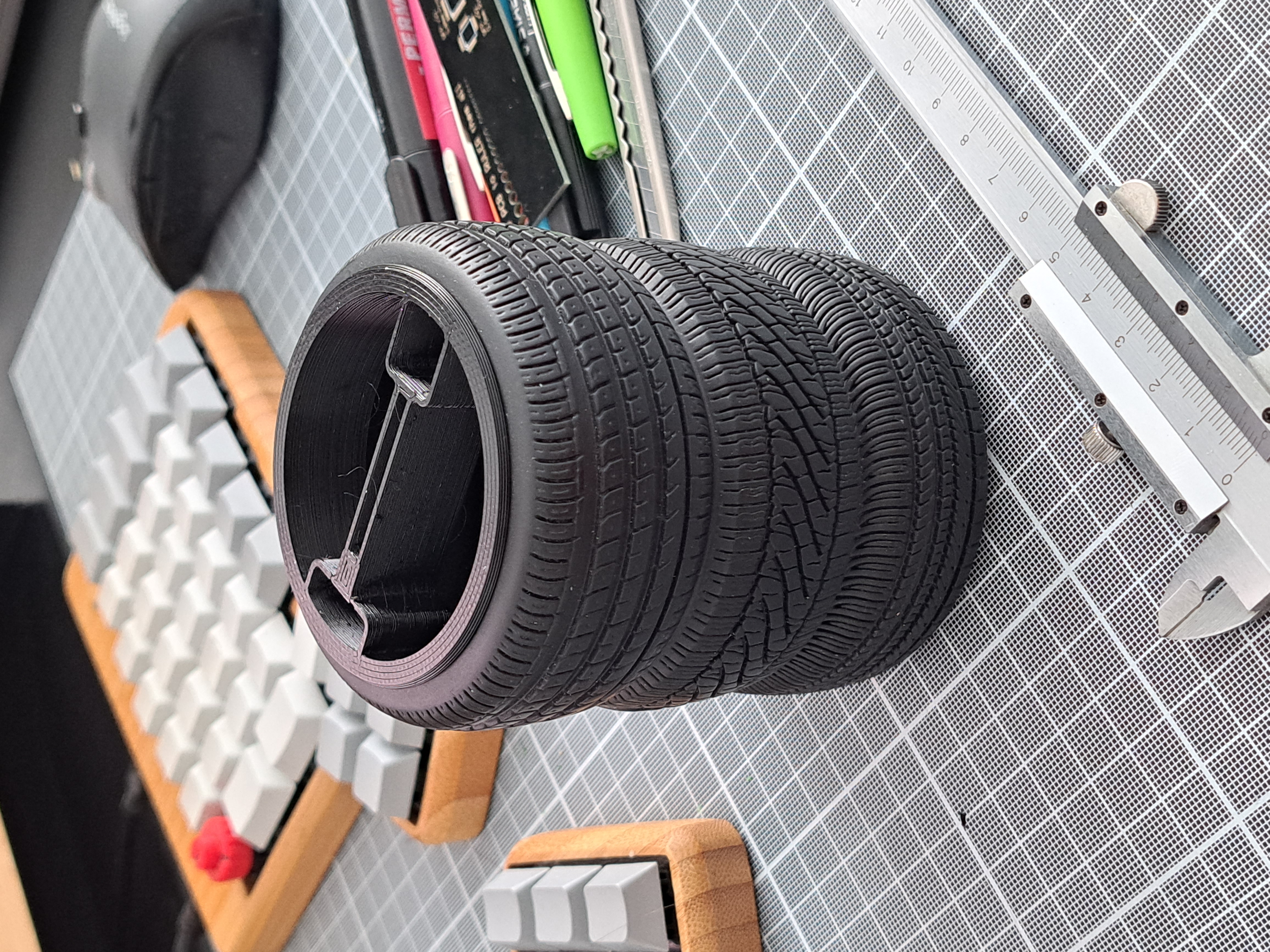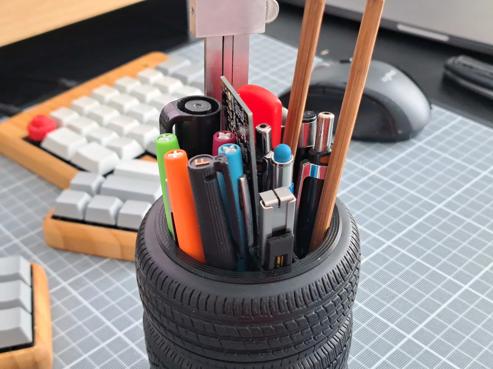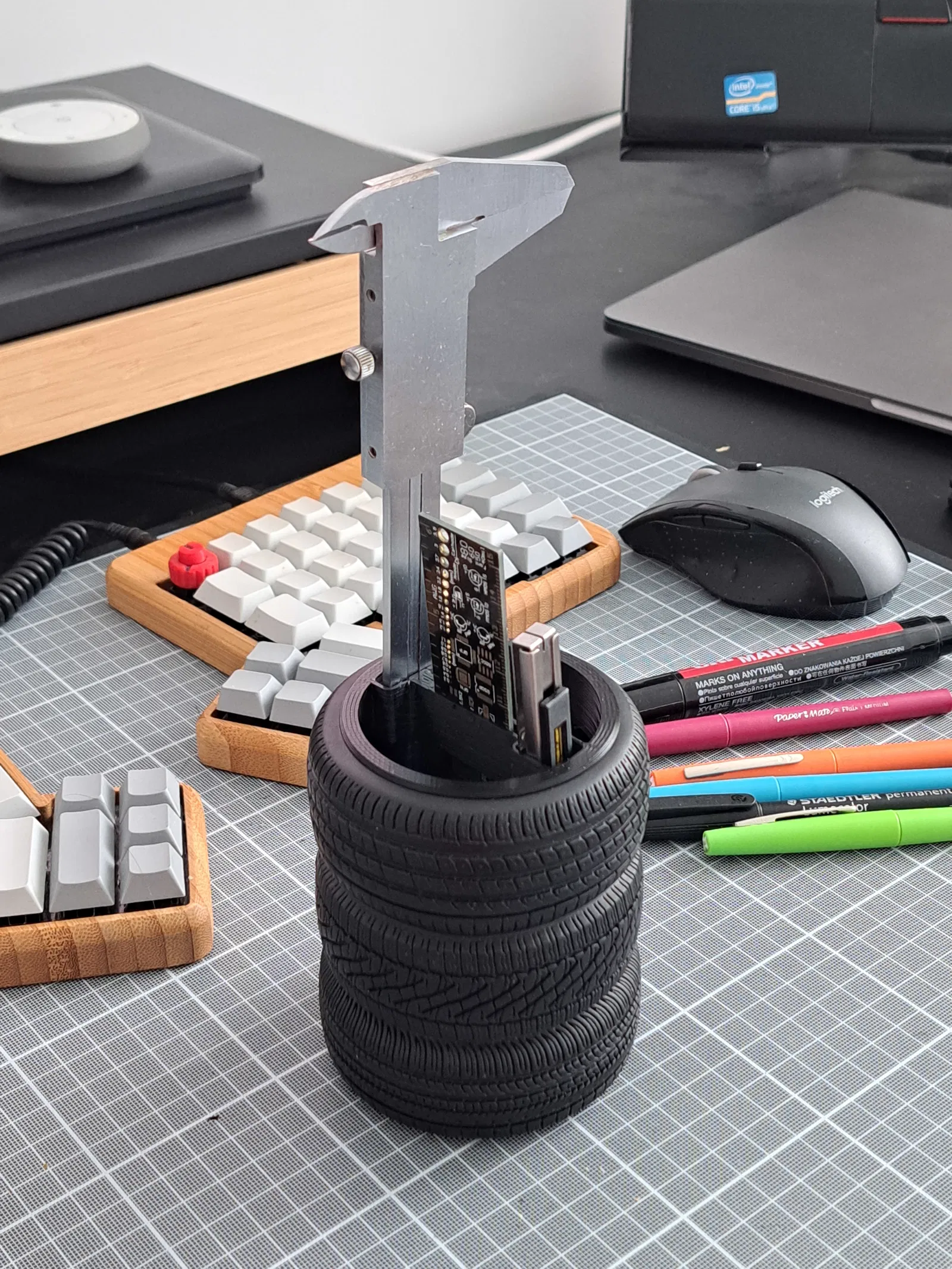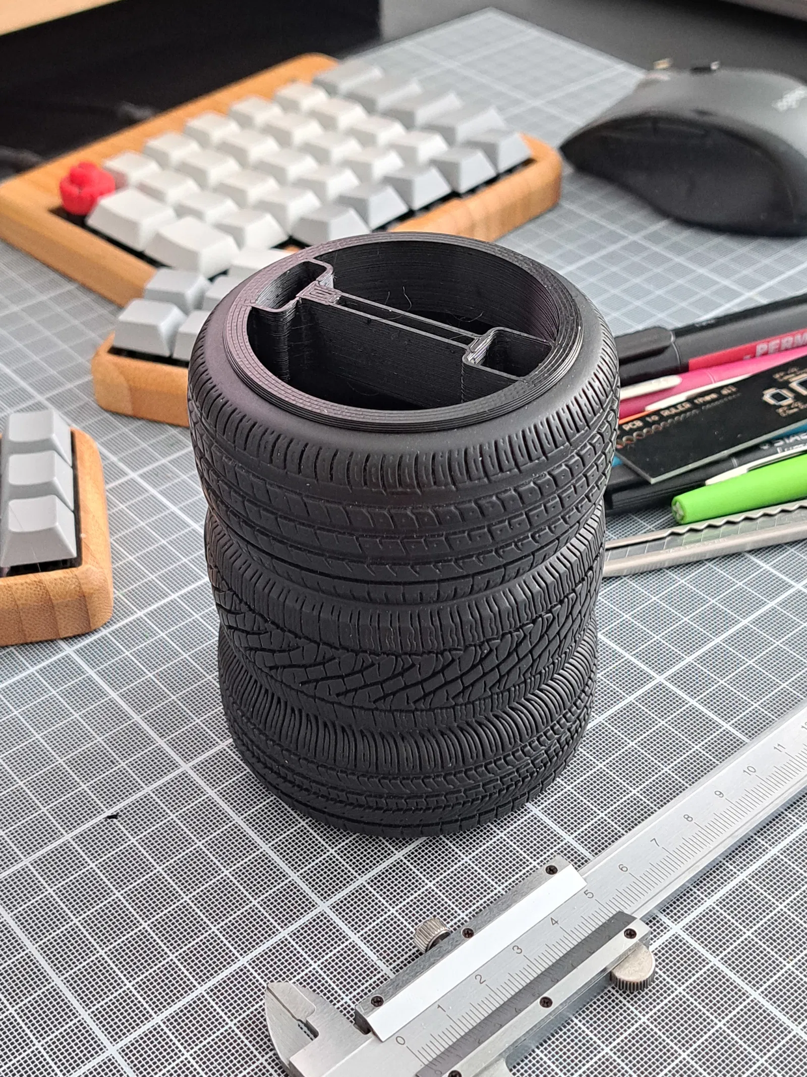 Một vách ngăn đơn giản, vừa vặn bên trong các đế bút hình trụ. Mình dùng để phân chia bút chì, bút bi với bút marker. Ở giữa có vài khe để đựng dao rọc giấy, thước kẻ và compa yêu thích. Chiếc đế bút thực tế là một cái ống để giữ lạnh đồ uống dạng lon. Trên printables có các mẫu tương tự ở đây. Có cả file STL và file FreeCAD.