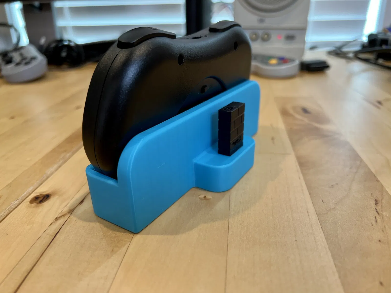 Vừa nhận được tay cầm kiểu Neo Geo CD 8bitdo và cảm thấy có cảm hứng để thiết kế một giá đỡ cho nó. Giá đỡ giữ tay cầm thẳng đứng ở góc 5 độ và có một chỗ ở phía sau để giữ dongle USB khi không sử dụng.