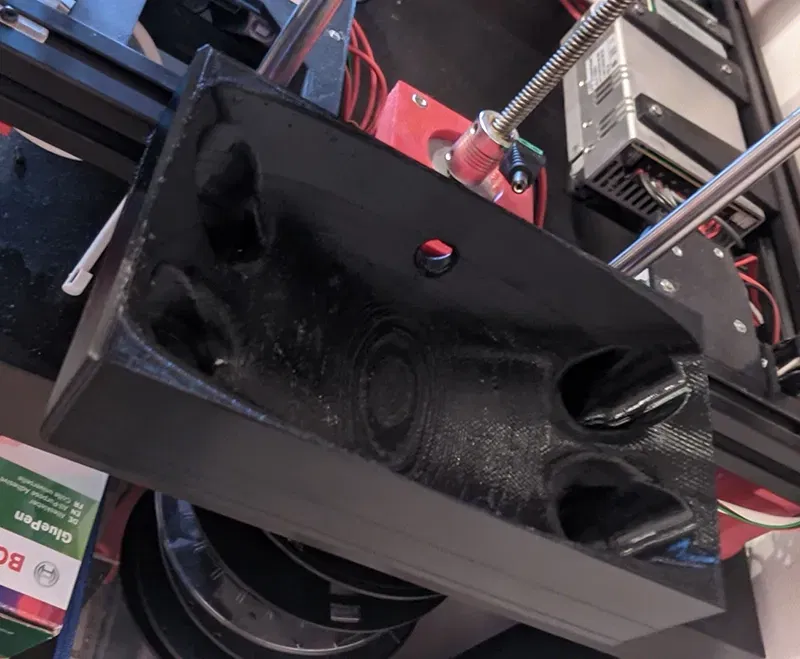 Cả hai giá đỡ cần phải được đặt đúng vị trí trước khi lắp phần lớn hơn, nếu không thì giá đỡ không thể được vặn vào khung của bạn. Cũng hãy đặt mô hình giá đỡ đáy xuống giường in của bạn và chỉ thêm hỗ trợ vào hai chốt định vị bên cạnh lỗ vít.