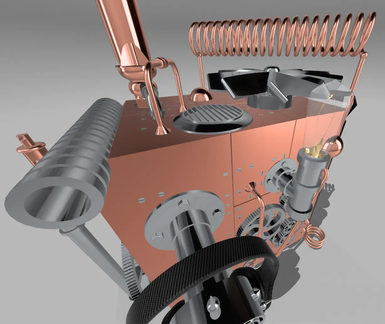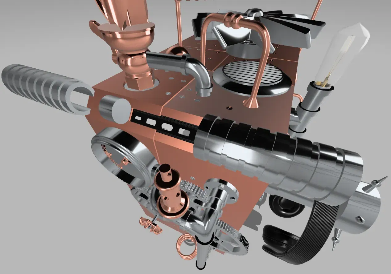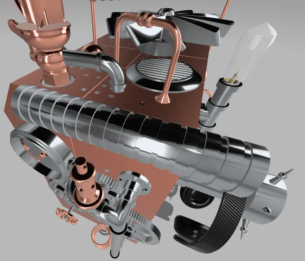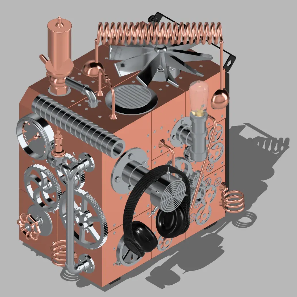 Steampunk là một nền văn hóa và thẩm mỹ thiết kế độc đáo và tưởng tượng, lấy cảm hứng từ những kỳ quan công nghệ của thế kỷ 19. Nó thường hình dung một lịch sử thay thế nơi sức mạnh hơi nước và các máy móc phức tạp thống trị, kết hợp các yếu tố như đồng, bánh răng, trục, thời trang Victorian, và một sự phong phú của các thành phần cơ khí và công nghiệp. Trong chủ đề Cooler Master Steampunk hoàn toàn có thể tùy chỉnh này, chúng tôi kết hợp thẩm mỹ của thời kỳ cơ khí thế kỷ 19 với phong cách hiện đại của Cooler Master và công nghệ đổi mới. Hãy tưởng tượng một hệ thống được làm mát một cách thông minh bằng freon siêu thấp, đồng thời sản xuất ra một sản phẩm phụ hấp dẫn: hơi nước bốc lên. Chủ đề này tích hợp một cách liền mạch các ống freon, ống làm mát trang trí, và các lỗ thông hơi phát ra hơi nước để đạt được sự kết hợp mê hoặc giữa steampunk và công nghệ làm mát tiên tiến. Kết quả là một chiếc PC đứng như một tác phẩm nghệ thuật và đổi mới đáng chú ý, được định sẵn để trở thành một điểm nói chuyện hấp dẫn. Chọn bất kỳ màu sắc nào bạn muốn để làm cho nó phù hợp với văn phòng và phong cách cá nhân của bạn. Quạt ở trên cùng và các bánh răng lớn hơn được trang bị vòng bi, cho phép chúng quay một cách dễ dàng khi được vận hành bằng tay. Ở phía trước của thùng PC, một ống trượt tiện lợi giúp quản lý cáp, làm cho việc định tuyến tai nghe và các thiết bị khác đến các cổng phía trước để kết nối nhanh chóng trở nên dễ dàng. Nếu bạn quyết định làm điều này, vui lòng đăng một sản phẩm với tùy chỉnh của riêng bạn. Bóng đèn, ghế, bàn, bàn nhỏ, bàn phím, màn hình, cây, và tai nghe không có ý định được in. Không có sửa đổi nào được thực hiện đối với các mô hình này (ngoại trừ bàn phím, mà tôi đã lấy từ một mô hình máy tính steampunk) vì chúng chỉ nhằm mục đích minh họa. Thay đổi duy nhất tôi thực hiện là hình ảnh hóa trên các mô hình, nhưng không có thay đổi vật lý nào. Tôi đã thực hiện tất cả hình ảnh hóa được thấy trong các bức ảnh. Các ghi chú được cung cấp dưới đây. Tôi đã lấy các ổ bi từ JLake3D, người mà các hướng dẫn của anh ấy đã đóng vai trò quan trọng trong hành trình mô hình 3D của tôi với Shapr3D. Khám phá kênh YouTube của anh ấy: JLake3D trên YouTube. Bạn cũng có thể tìm thấy nhiều thiết kế của anh ấy trên Thingiverse dưới tên DrewBrew: DrewBrew trên Thingiverse. Để xem các thiết kế F3D của anh ấy, hãy truy cập tài khoản của anh ấy tại đây: JLake3D trên F3D. Tệp ổ bi có thể được tìm thấy ở đây: Ổ bi 608 tối ưu trên F3D. Tai nghe được sử dụng để hiển thị: https://www.cgtrader.com/items/2842855/download-page. Bóng đèn được sử dụng để hiển thị: https://sketchfab.com/3d-models/edison-light-bulb-6b75c383bd824c01992791e1493807c0. Ghế được sử dụng để hiển thị: https://sketchfab.com/3d-models/armchair-steampunk-a8d63bf8b4b040098647d37738b2ced0. Bàn được sử dụng để hiển thị: https://sketchfab.com/3d-models/desk-steampunk-25ae55fa639c43c3b7d2c00bc483ac80. Bàn mini được sử dụng để hiển thị: https://www.cgtrader.com/free-3d-models/furniture/table/square-coffee-table-large-by-gommaire. Mô hình mà tôi đã trích xuất bàn phím từ: https://sketchfab.com/3d-models/steampunk-style-computer-b323e5e34055411daaa797fb1cf8c535. Màn hình được sử dụng để hiển thị: https://sketchfab.com/3d-models/steampunk-apocalypse-tv-set-e231602fc9124362888d9e96d734e8dc. Cây được sử dụng để hiển thị: https://www.cgtrader.com/free-3d-models/plant/pot-plant/areca-palm-indoor-plant. Tủ sách được sử dụng để hiển thị: https://www.cgtrader.com/free-3d-models/furniture/other/dusty-old-booshelf.
