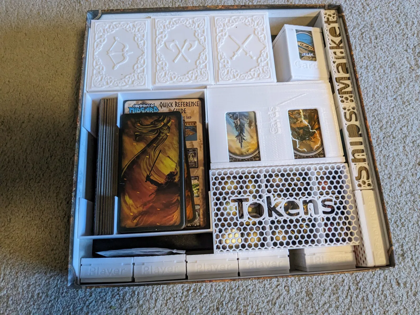 Tôi bắt đầu bằng cách in các hộp dice/token tại. Nhưng sau đó tôi không thể tìm thấy cách tuyệt vời để tổ chức phần còn lại của các mảnh trò chơi. Có một vài tổ chức khác ở đó nhưng một số không hỗ trợ cả hai phần mở rộng. Tôi cũng thích có một cách tiếp cận mô-đun hơn để mỗi người chơi có một hộp riêng, các token có thể được rút thẳng từ các thùng chứa của chúng, các mảnh liên quan được để cùng nhau và các mảnh riêng biệt không bị lẫn lộn. Mục tiêu của tôi là làm cho các tổ chức giảm thiểu thời gian thiết lập. Điều này còn xa mới hoàn hảo, nhưng đây là tổ chức đầu tiên của tôi, vì vậy tôi hy vọng nó sẽ đủ hữu dụng cho bạn. Tôi đã tạo ra những điều này bằng cách sử dụng và bao gồm các tệp openscad để bạn có thể điều chỉnh chúng theo cách bạn muốn. Chúc bạn vui vẻ!