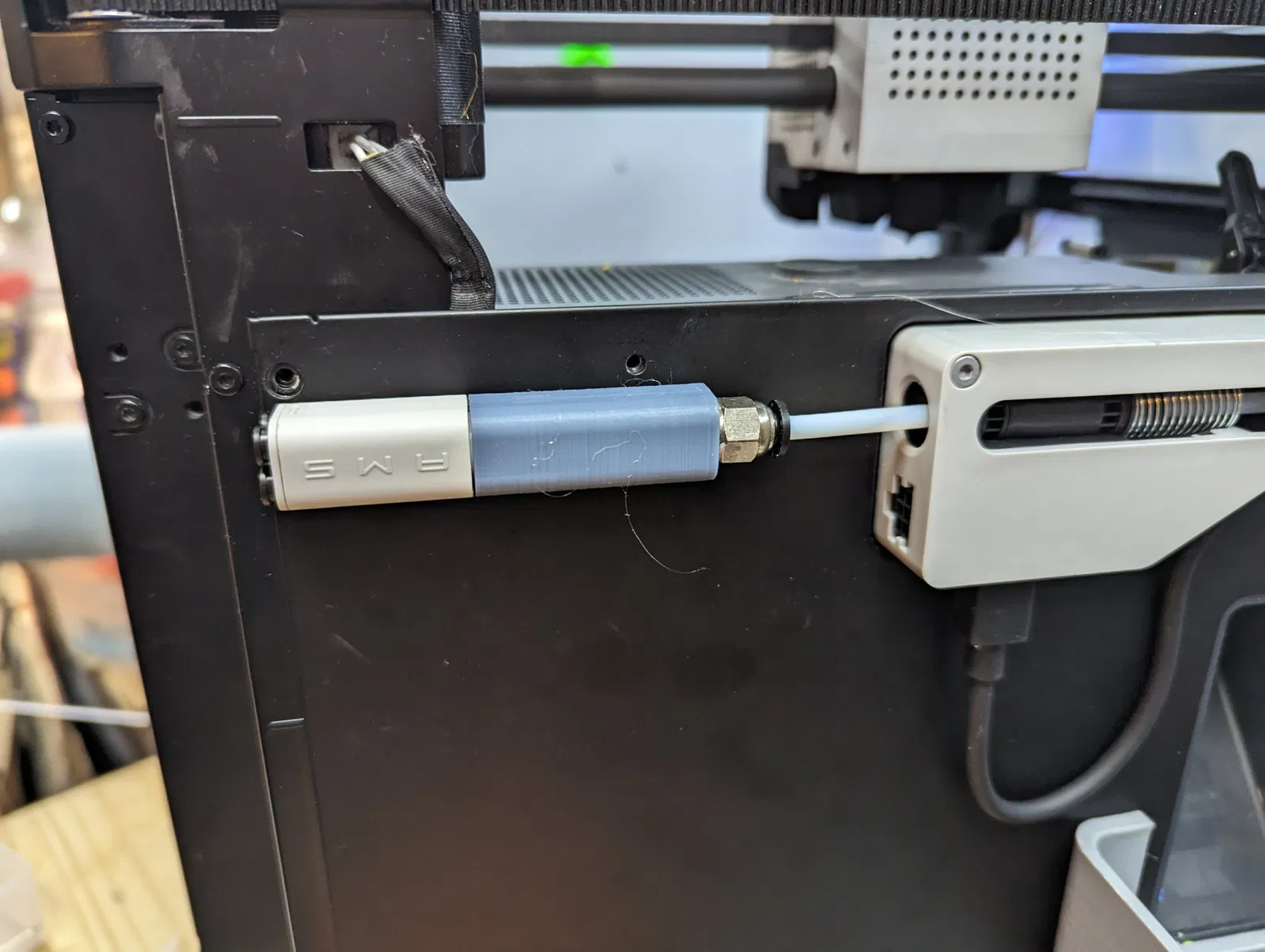 Tôi đã làm một giá đỡ cho nó để bạn có thể gắn vào phía sau máy in; một đoạn ngắn PTFE sẽ đi thẳng vào bộ đệm, giúp ngăn ngừa các vấn đề về cấp liệu/rút lui. Tuy nhiên, hướng lý tưởng để cấp liệu trực tiếp vào bộ đệm là bộ chia được gắn trực tiếp vào tấm phía sau. Một ít băng keo hai mặt mỏng (như một số thương hiệu băng keo siêu dính) trên giá đỡ sẽ hoạt động hoàn hảo. Bạn chỉ cần phải tháo bộ đệm nếu bạn muốn kéo ống sau khi gắn nó theo cách này.