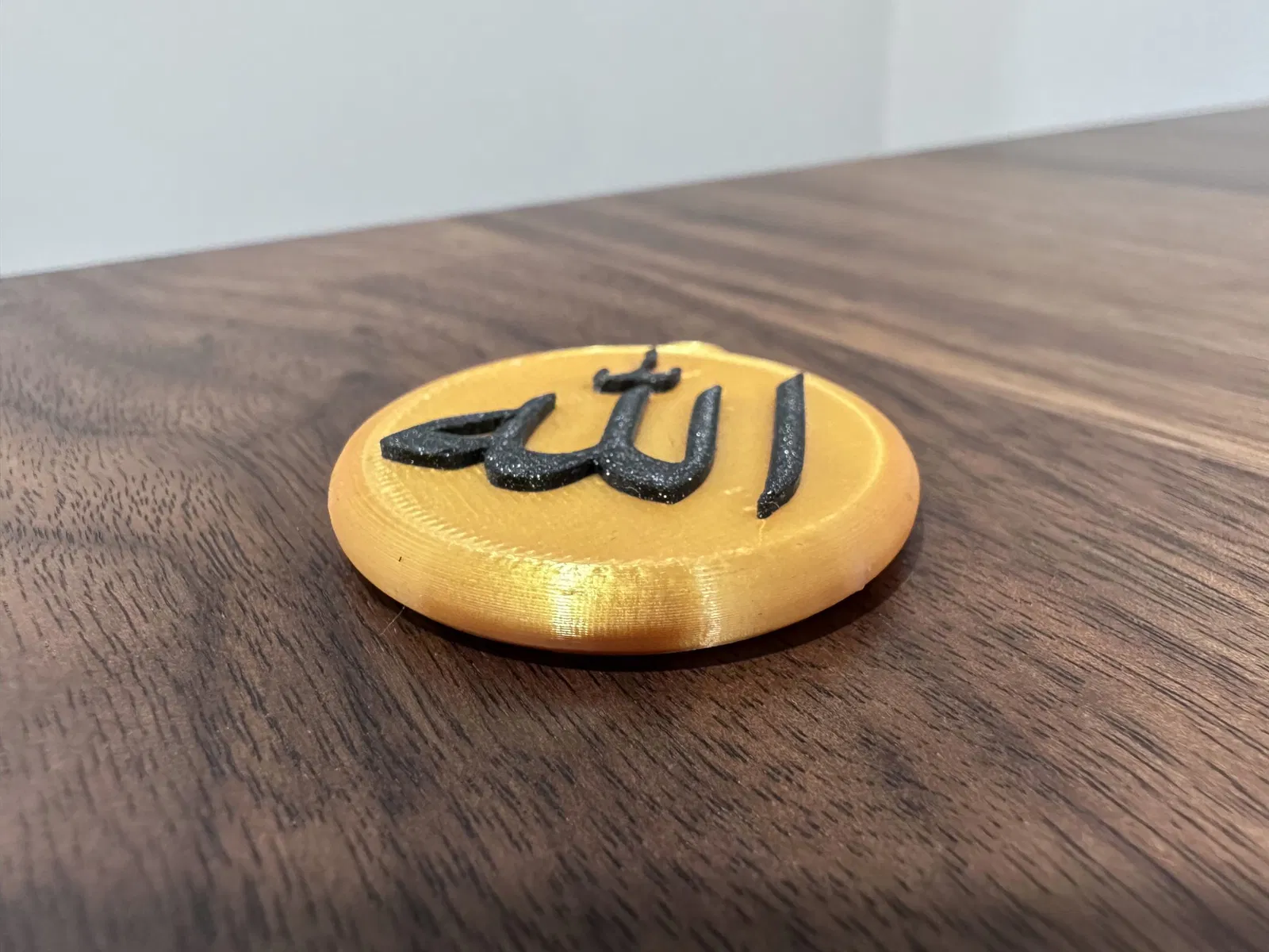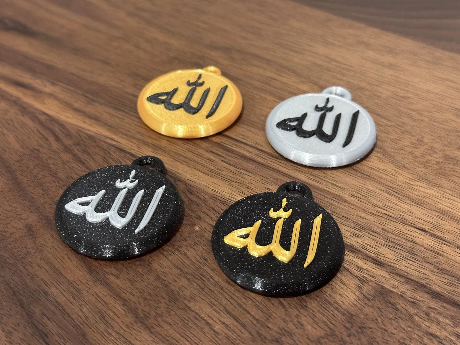 Một móc khóa nhỏ nói "Allah" trong tiếng Ả Rập. Cơ thể và chữ cái có thể được in bằng hai màu khác nhau.