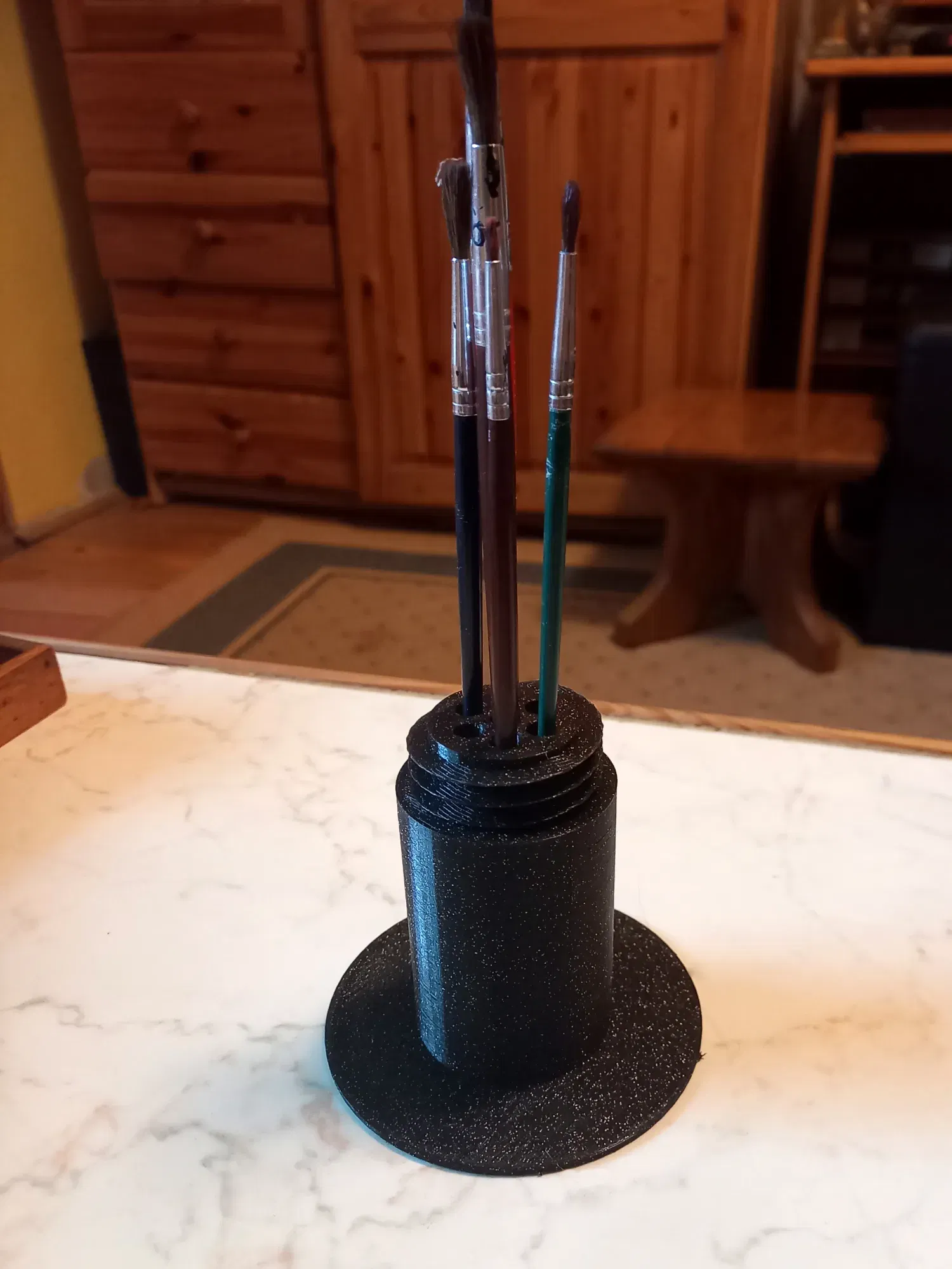 Cuộn sẽ trượt dễ dàng lên giá đỡ cuộn, và với một ít keo siêu dính, bạn có thể gắn các giá đỡ sơn vào cuộn. Phần trên của giá đỡ cuộn có ren, vì vậy bạn có thể xếp chồng chúng mà không làm đổ. Bảy cọ cũng có thể được lưu trữ trong giá đỡ cuộn.