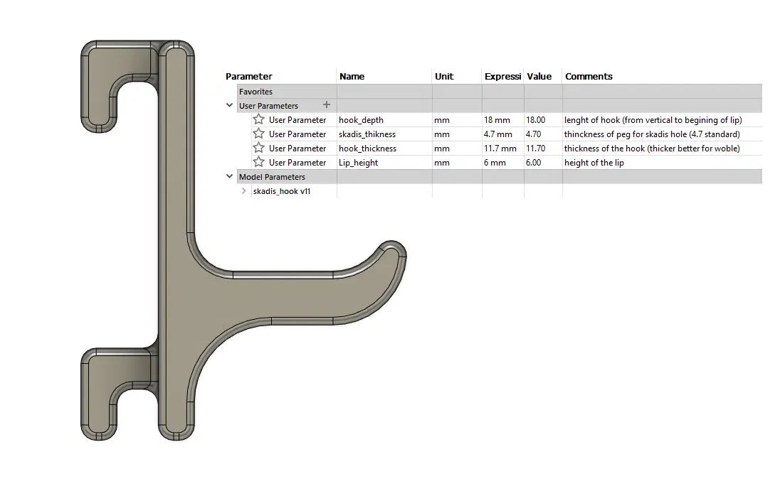 2022-10-14: Đã sửa các cài đặt tham số để cho phép thay đổi chiều dài của móc, độ dày và chiều cao của mép. Cũng đã thêm một móc skadis thứ hai ở dưới cùng để thay thế chốt khóa, giúp móc an toàn hơn.