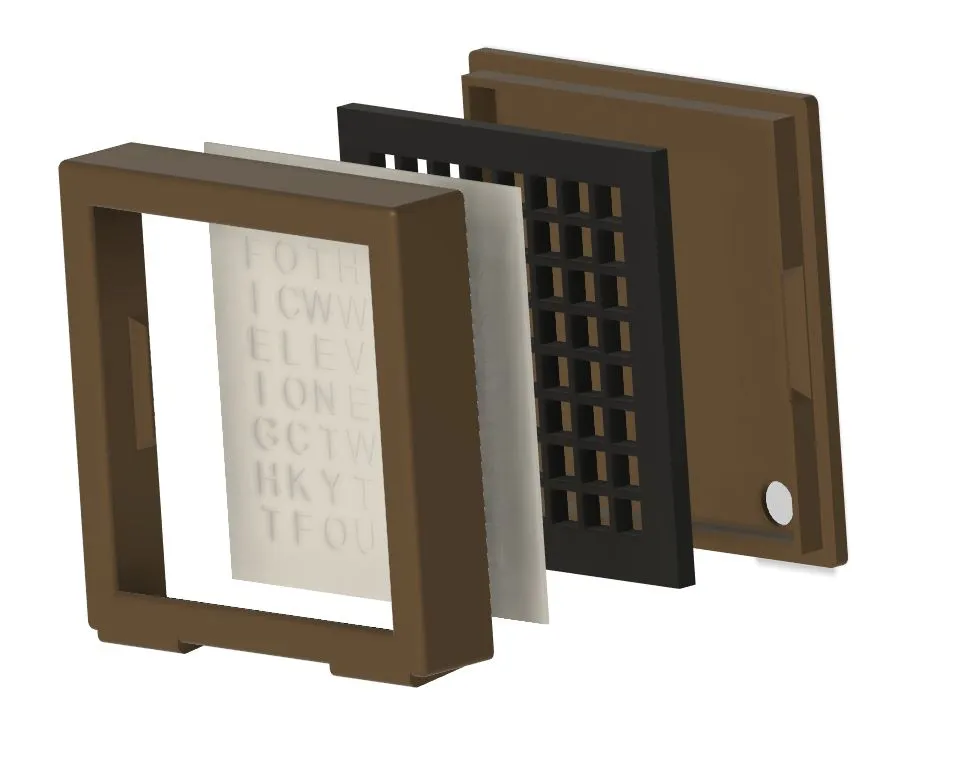 Ma trận 8x8 của tôi lớn hơn cái trong dự án gốc nên tôi đã tận dụng cơ hội để thiết kế lại vỏ. Nó cũng được sắp xếp đèn LED theo kiểu serpentine thay vì cấu hình từ trái sang phải, theo hàng, vì vậy tệp mã ma trận đã được cập nhật có sẵn tại https://github.com/GSVNoFixedabode/CodeBits/blob/main/HourStrings_EN.h