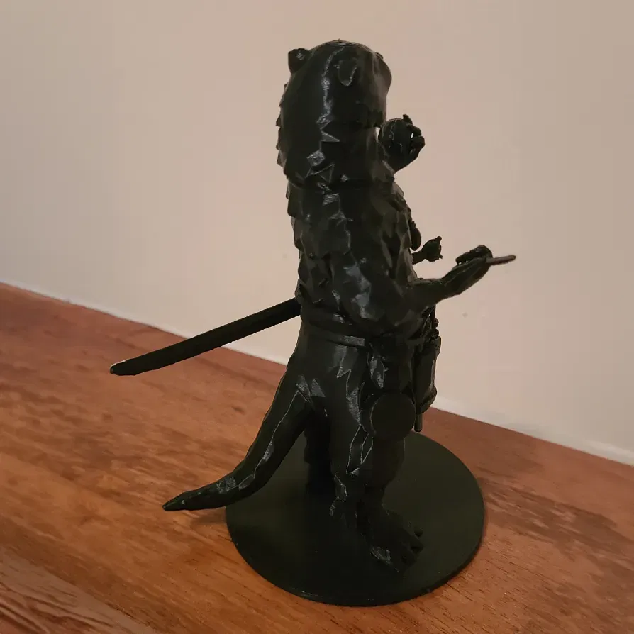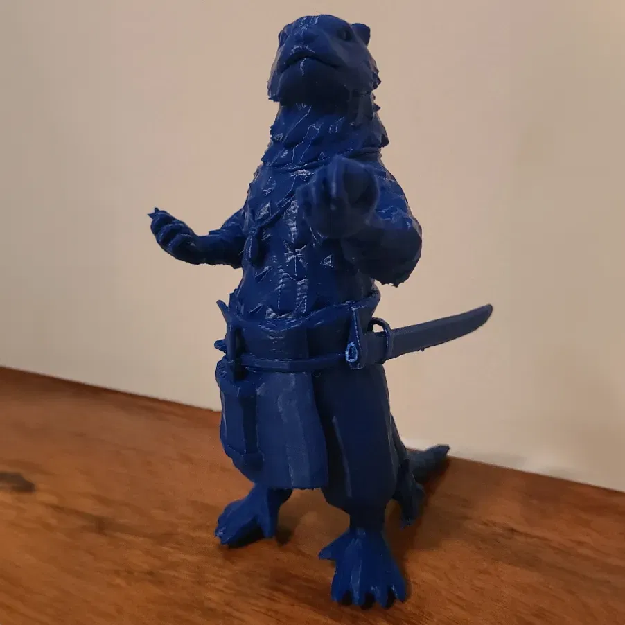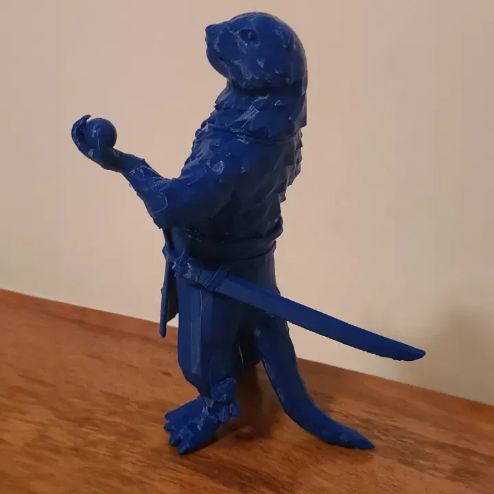 Tôi đang thử nghiệm với việc xuất các mô hình đa giác truyền thống để in 3D. Tôi đã tìm thấy một mô hình con rái cá tuyệt vời trên Sketchfab mà tôi muốn chia sẻ để người khác in. Tôi đã thêm một nền tảng cơ sở vào mô hình vì chân không phẳng; tuy nhiên, tôi gặp khó khăn trong việc hỗ trợ chuôi kiếm của Peanut, và nó đã bị gãy—có thể bạn sẽ có may mắn hơn. Ngoài ra, tôi đã bao gồm một phiên bản không có nền tảng, trong trường hợp bạn thích theo cách đó. Không có nền tảng, nó sẽ nằm trên đuôi, như trong hình.