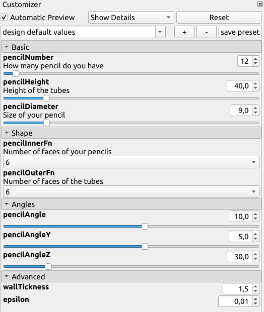 holder.scad; - Tùy chỉnh giá đỡ bút của bạn. (Nếu trình tùy chỉnh bị ẩn, hãy bỏ chọn mục cuối cùng trong menu view: "Hide Customizer");