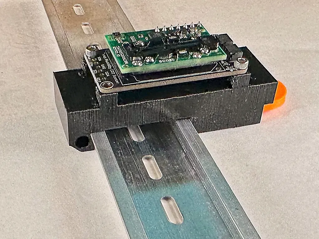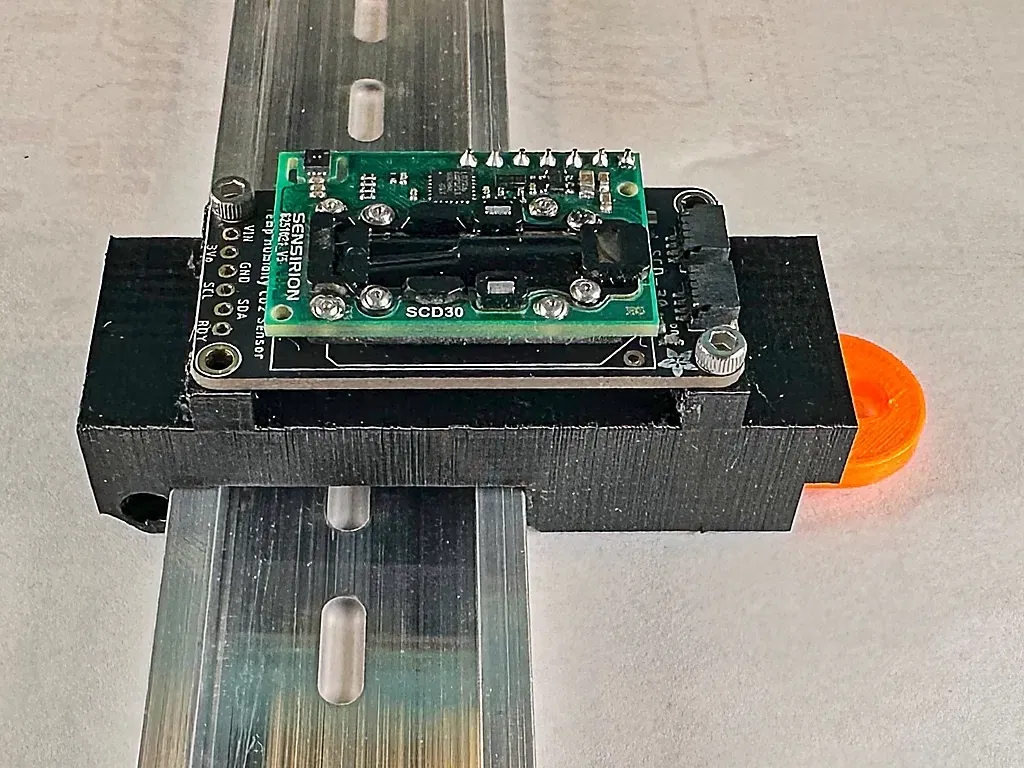 Một giá treo dựa trên đường sắt DIN cho cảm biến SCD-30 CO2 của Adafruit. Cảm biến có thể được tìm thấy tại