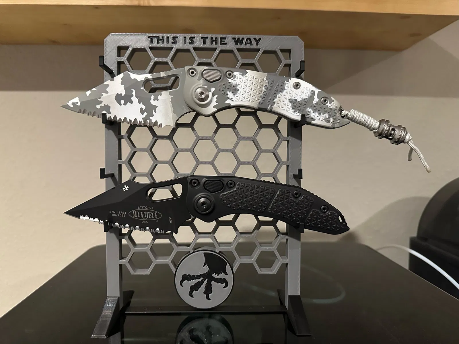 Đứng để giữ dao bỏ túi, với logo microtech ở phía dưới.