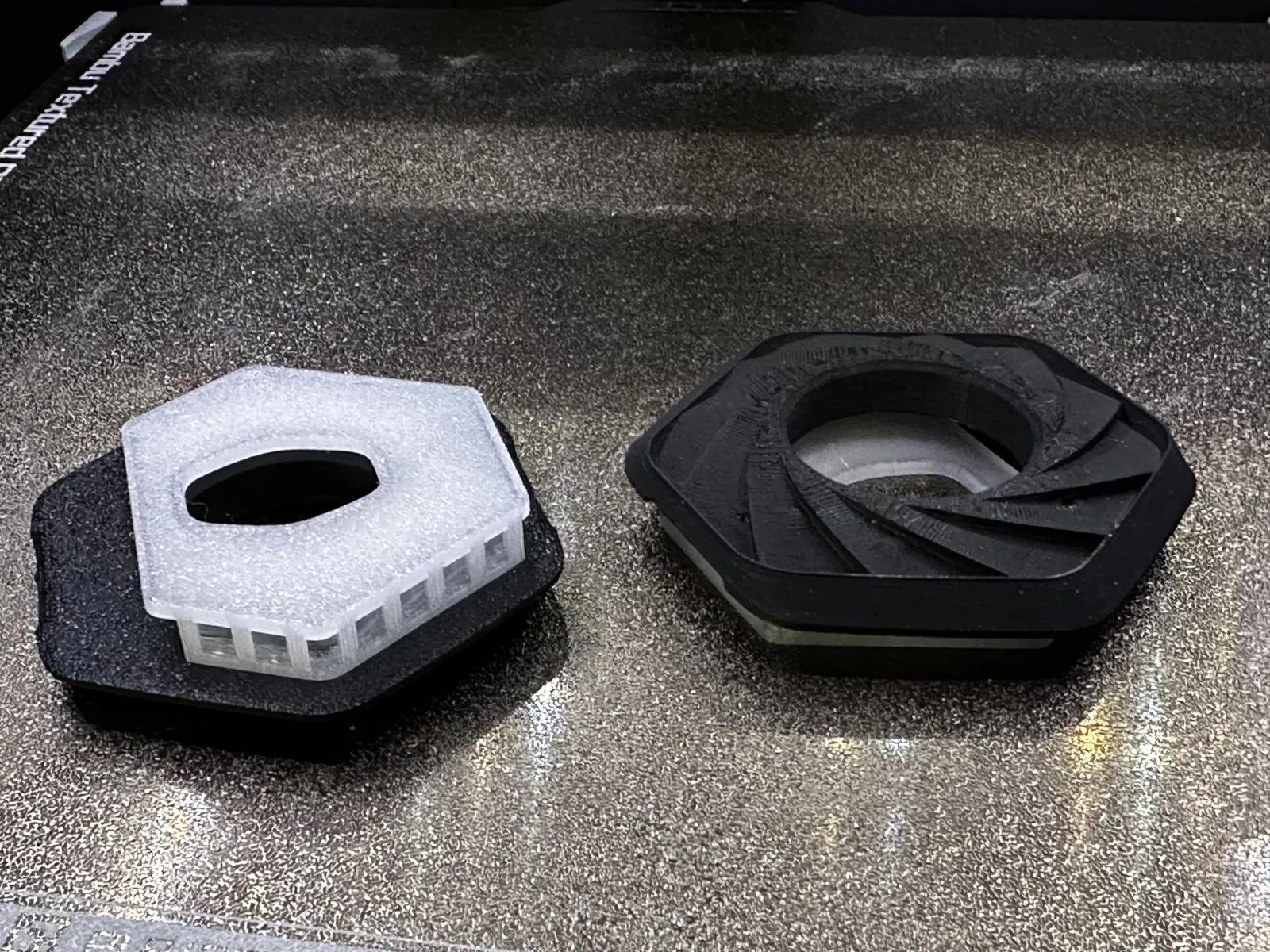Bản in của tôi được hiển thị trong các bức ảnh được in bằng PLA đen tái chế của Protopasta, nó rất không trong suốt và có một số mảnh lấp lánh ở đó (từ vật liệu tái chế) Nó sẽ trông rất đẹp trong một cái thùng nhưng tiếc là tôi chưa có một Atmos (chưa ;p)