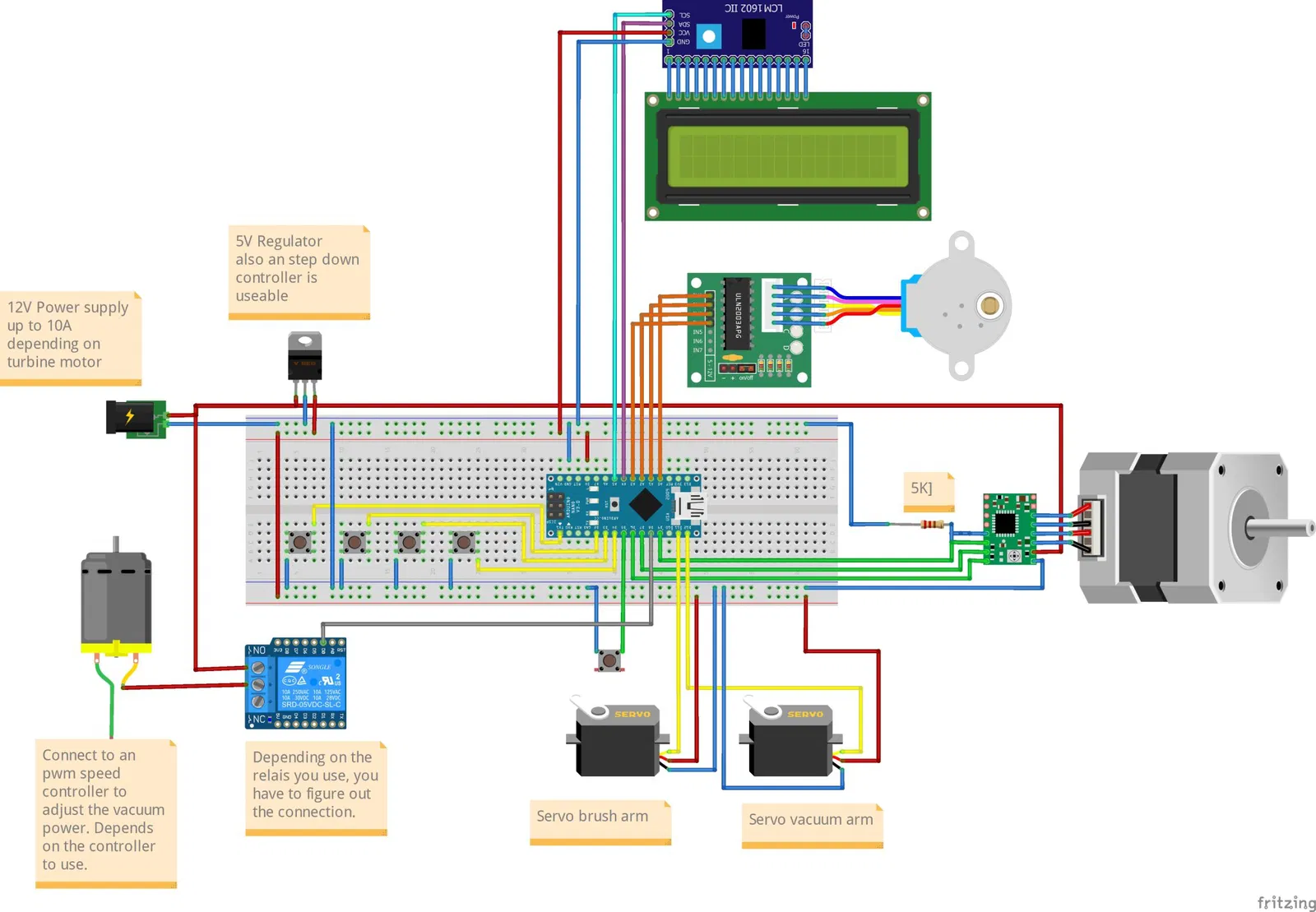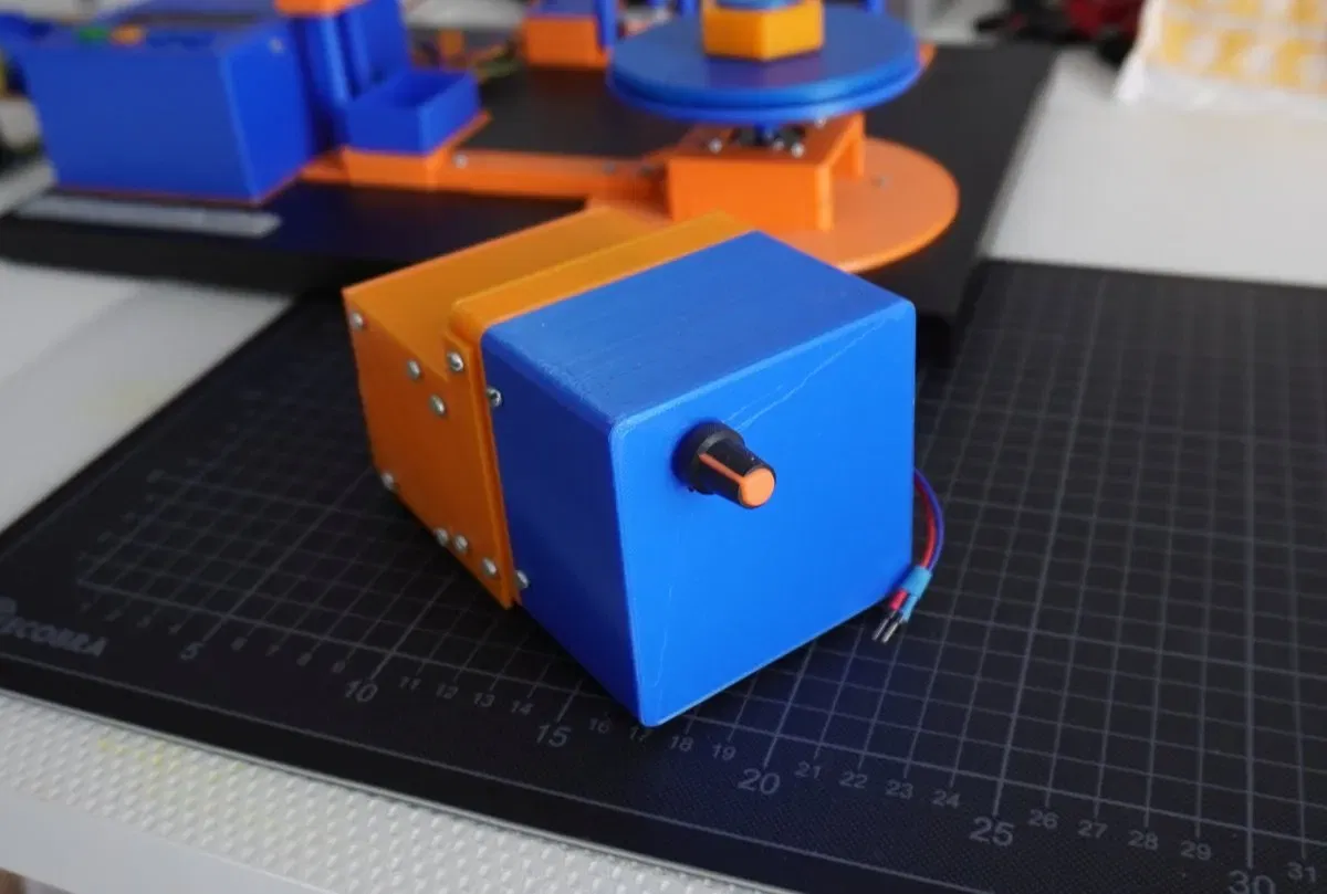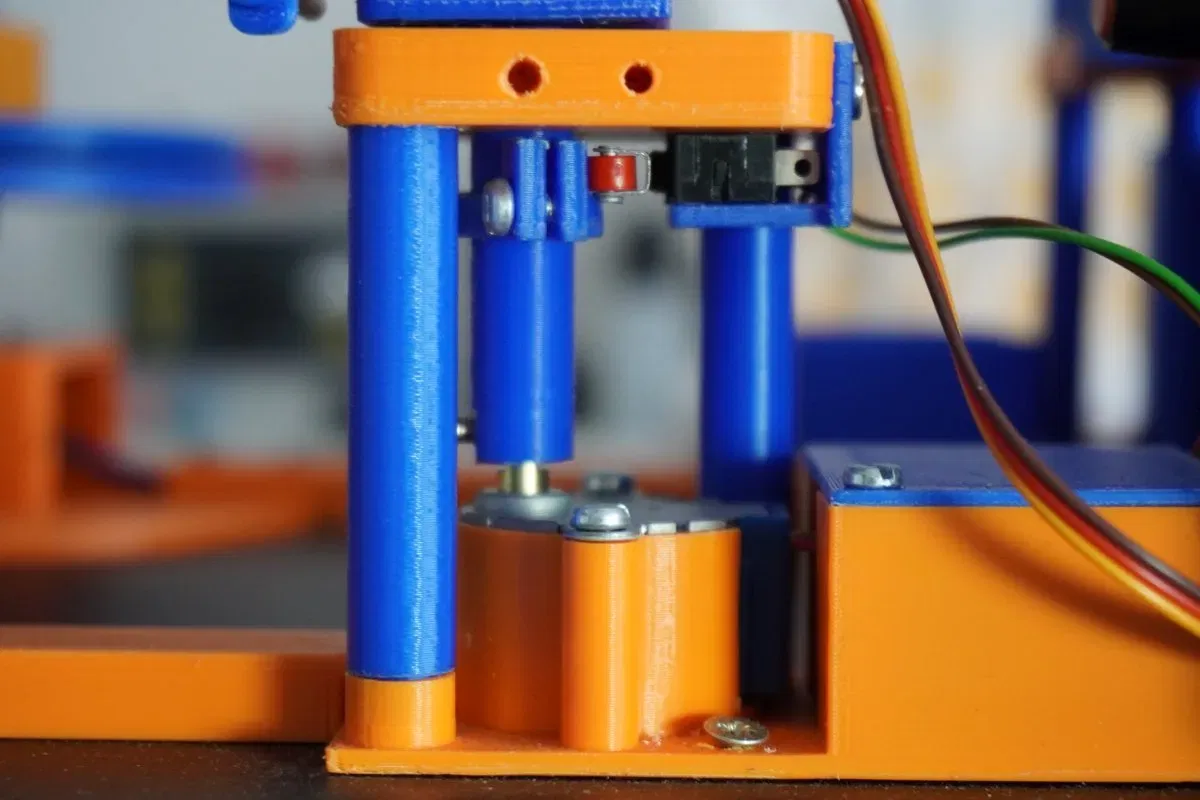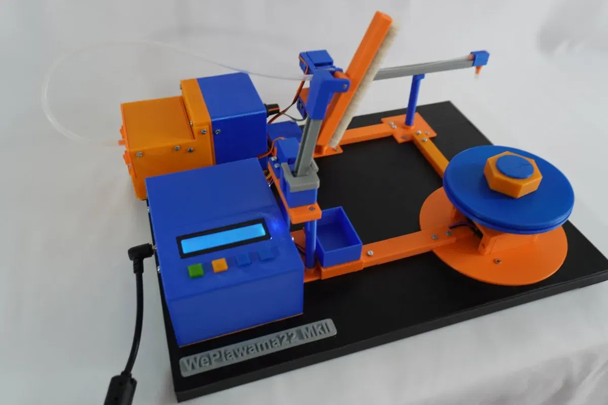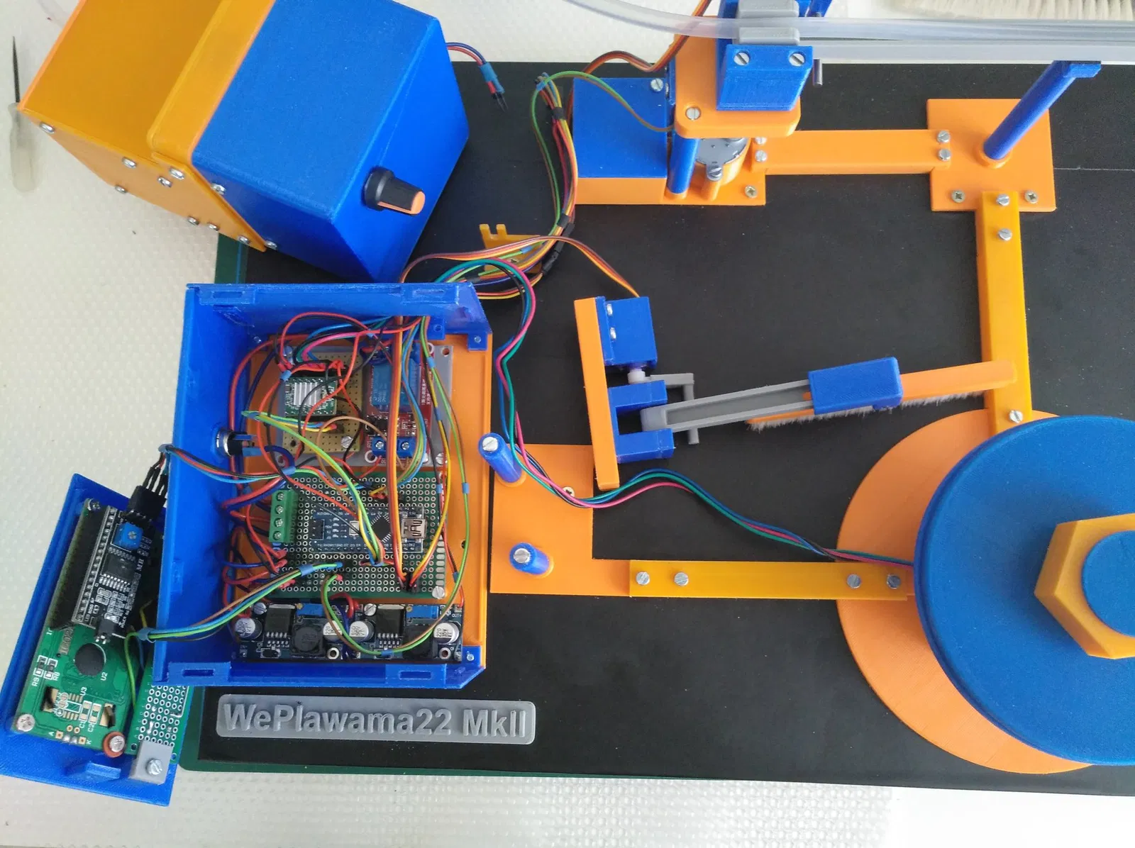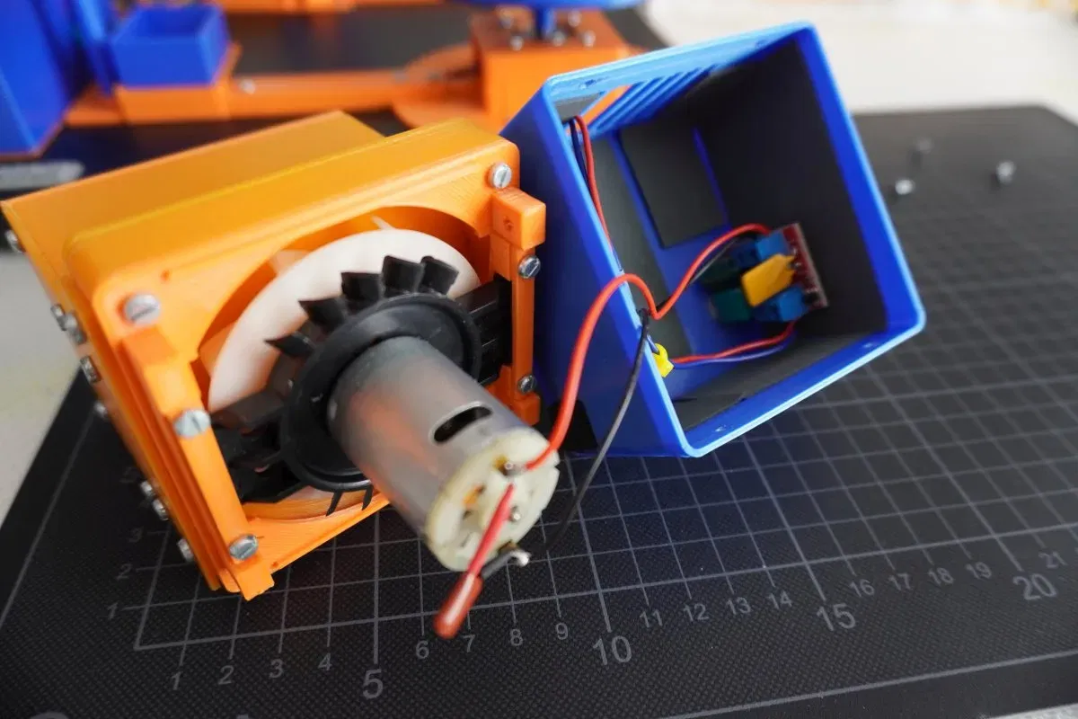 Chiếc máy nên được thực hiện càng hoàn chỉnh càng tốt bằng máy in 3D. Được trang bị một chút điện tử. Nó được điều khiển bởi một Arduino Nano. Hiện tại nó thậm chí còn có một số không gian cho việc mở rộng. Ngoài ra, có một cặp động cơ bước và điện tử điều khiển, cũng như hai servo và một tua-bin hút 12V.