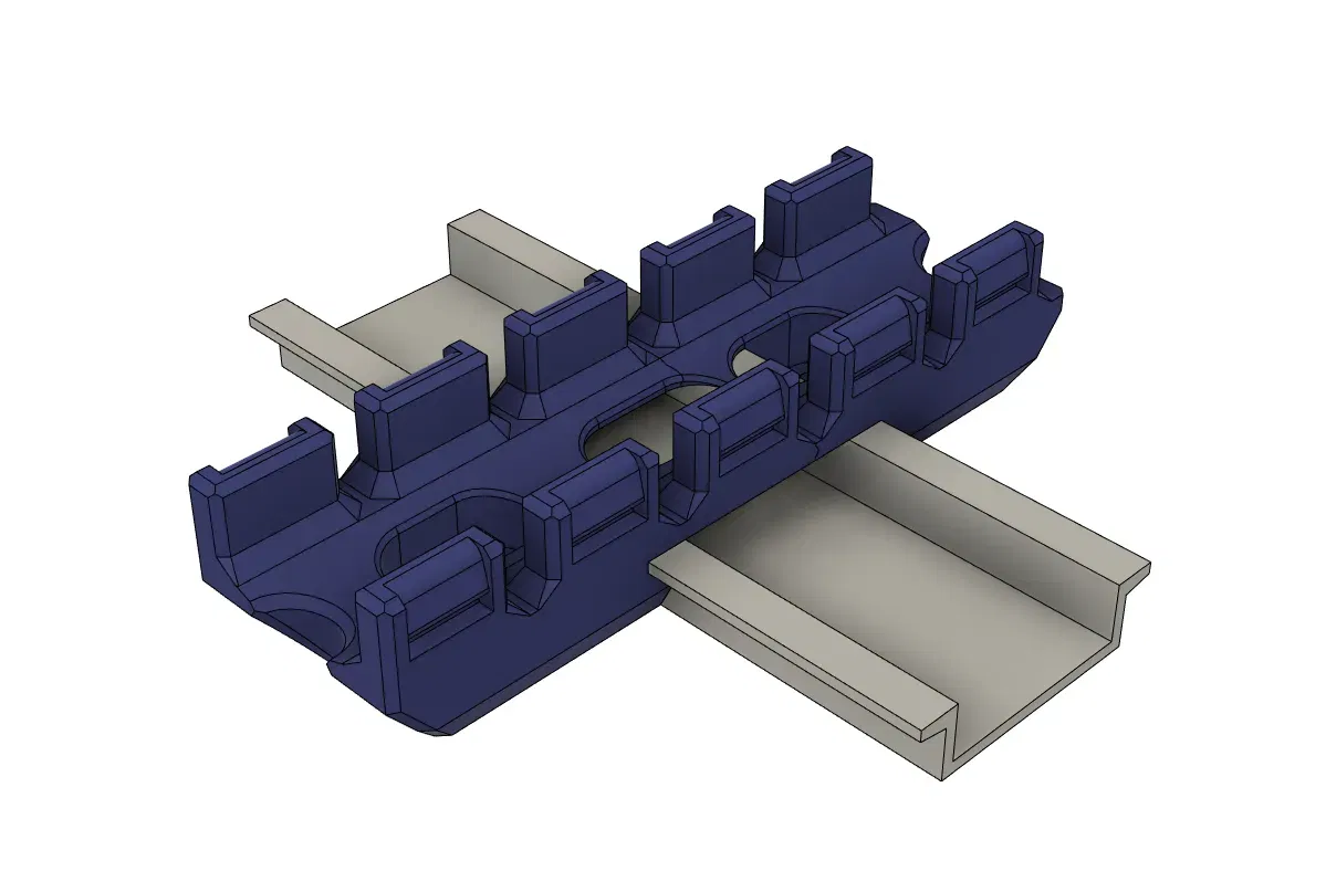 Thêm các đầu vát cho việc định tuyến dây bổ sung và một đáy cong với một trung tâm rãnh để định tuyến các dây lớn hơn vào ray DIN.