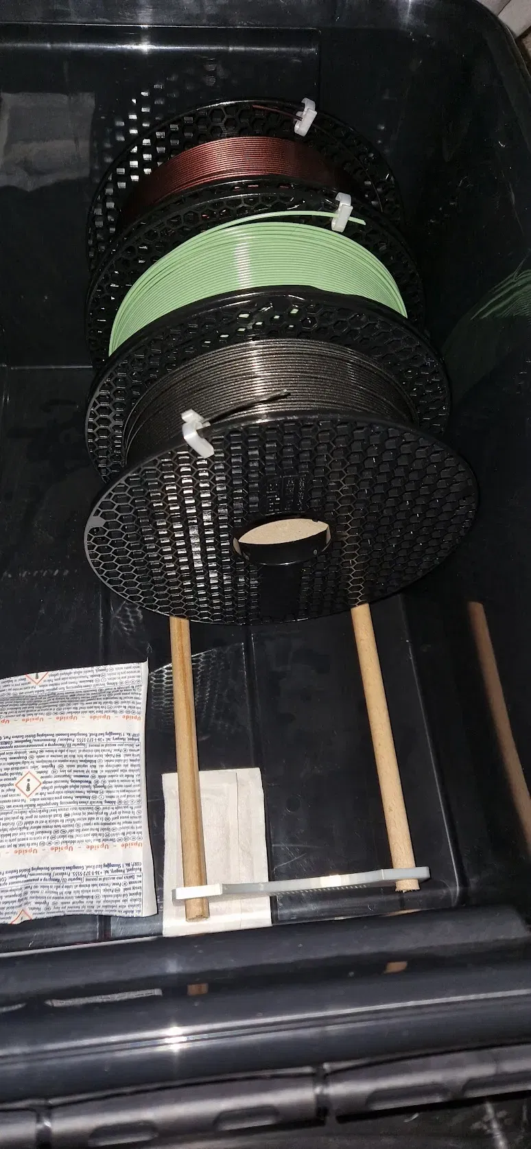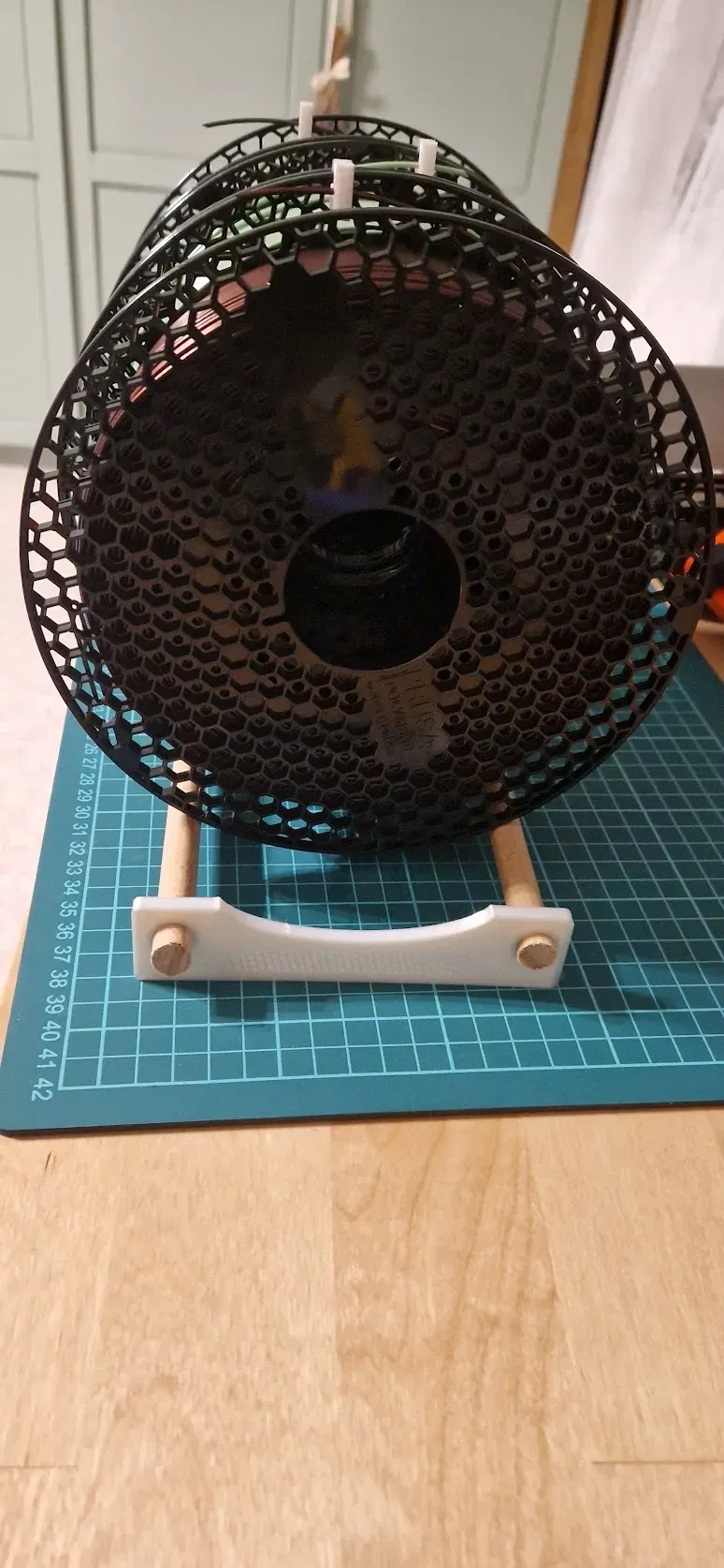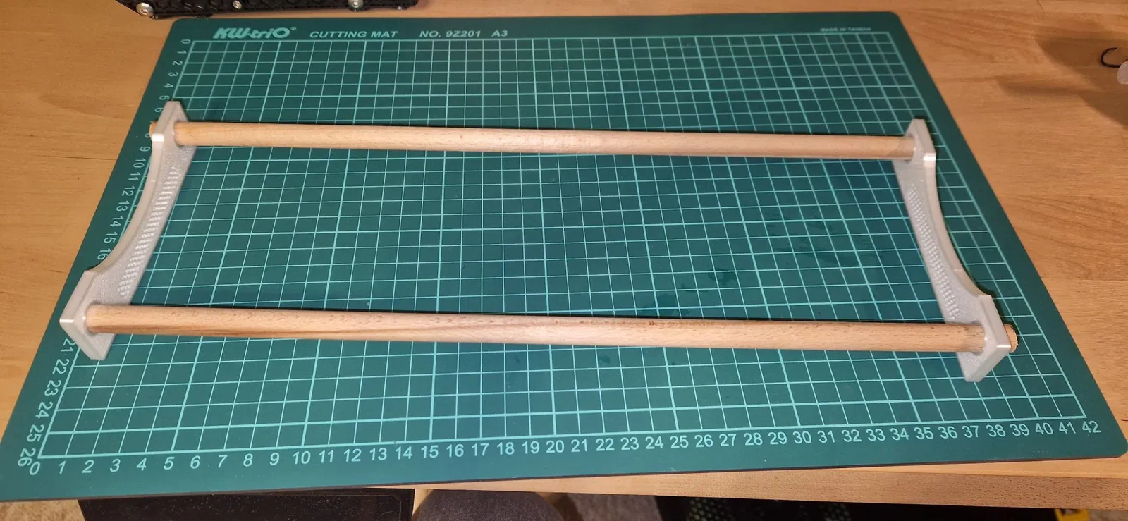 Giá đỡ được thiết kế để giữ cuộn chỉ ở một chỗ. Trong một hộp hoặc trên một kệ. Nó sử dụng hai thanh gỗ với bán kính khoảng ~6mm. Kích thước có thể được thay đổi trong mô hình openscad (xem tệp hoặc repo)