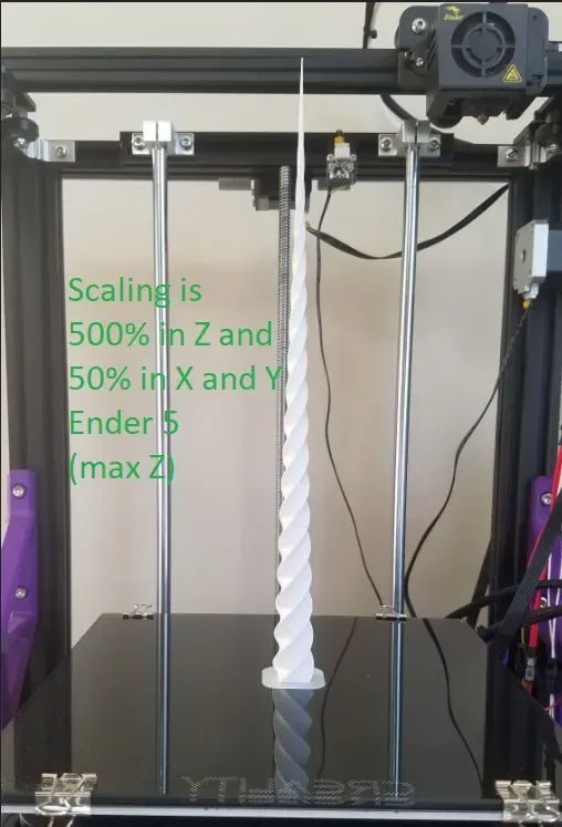 Tôi đã in ở tỷ lệ 500% trong Z và 50% trong X và Y, đó là tỷ lệ Z tối đa mà eSlicer cho phép theo mặc định cho một Ender 5. Tôi đã sử dụng chiều cao lớp 0.28 mm. Tôi muốn xem máy in của tôi sẽ hoạt động như thế nào với một cái gì đó cao tối đa. Nó đã hoạt động. Tôi đã bao gồm một bức ảnh của điều đó.