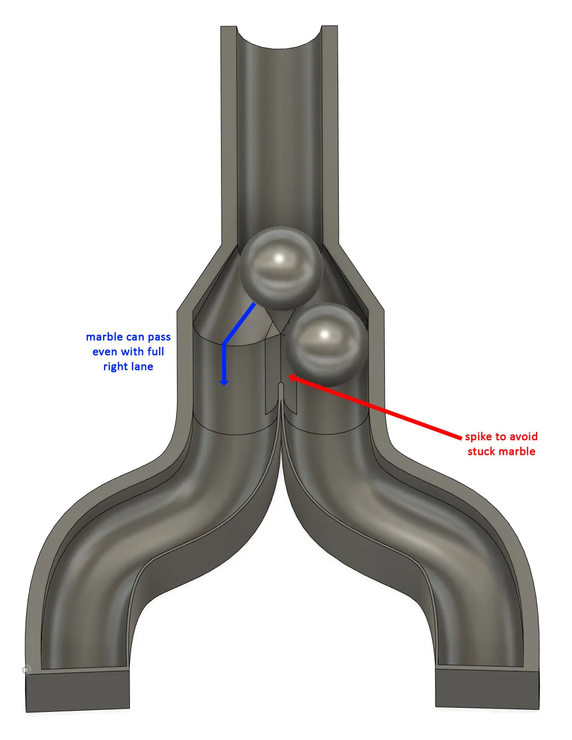 Được thiết kế cho viên bi 16mm nhưng do thiết kế tham số nên sẽ dễ dàng sửa đổi cho các kích thước khác. Để sửa đổi theo nhu cầu của bạn, hãy thay đổi đường kính viên bi và điều chỉnh tham số "marble_pass_length" (kích thước của kênh bên ở giao lộ) để đạt được hành vi mong muốn.
