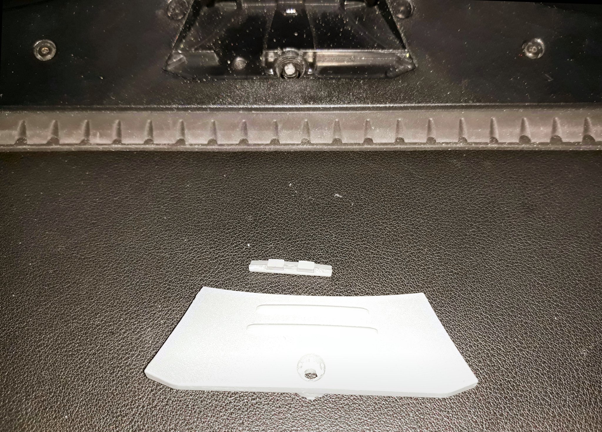 Khi kiểm tra lý do tại sao cái đầu không giữ được vị trí, tôi nhanh chóng phát hiện một mảnh nhựa màu xám nhỏ trên sàn. Mảnh này là phần còn lại của chốt được thiết kế để giữ thiết bị ở vị trí, và thật dễ dàng để thấy tại sao nó lại bị gãy: Để tiết kiệm một lượng nhựa nhỏ, Karcher đã thêm hai khe vào nơi mà chốt được gắn vào tab thả (xem hình ảnh). Tôi chắc chắn rằng điều này giúp Karcher tiết kiệm một khoản tiền lớn trong chi phí sản xuất trong suốt vòng đời sản phẩm, nhưng nó cũng làm yếu đi đáng kể khuôn, và cho phép các lực tác động lên cái đầu từ việc gạt nước làm nó uốn cong cho đến khi bị gãy.