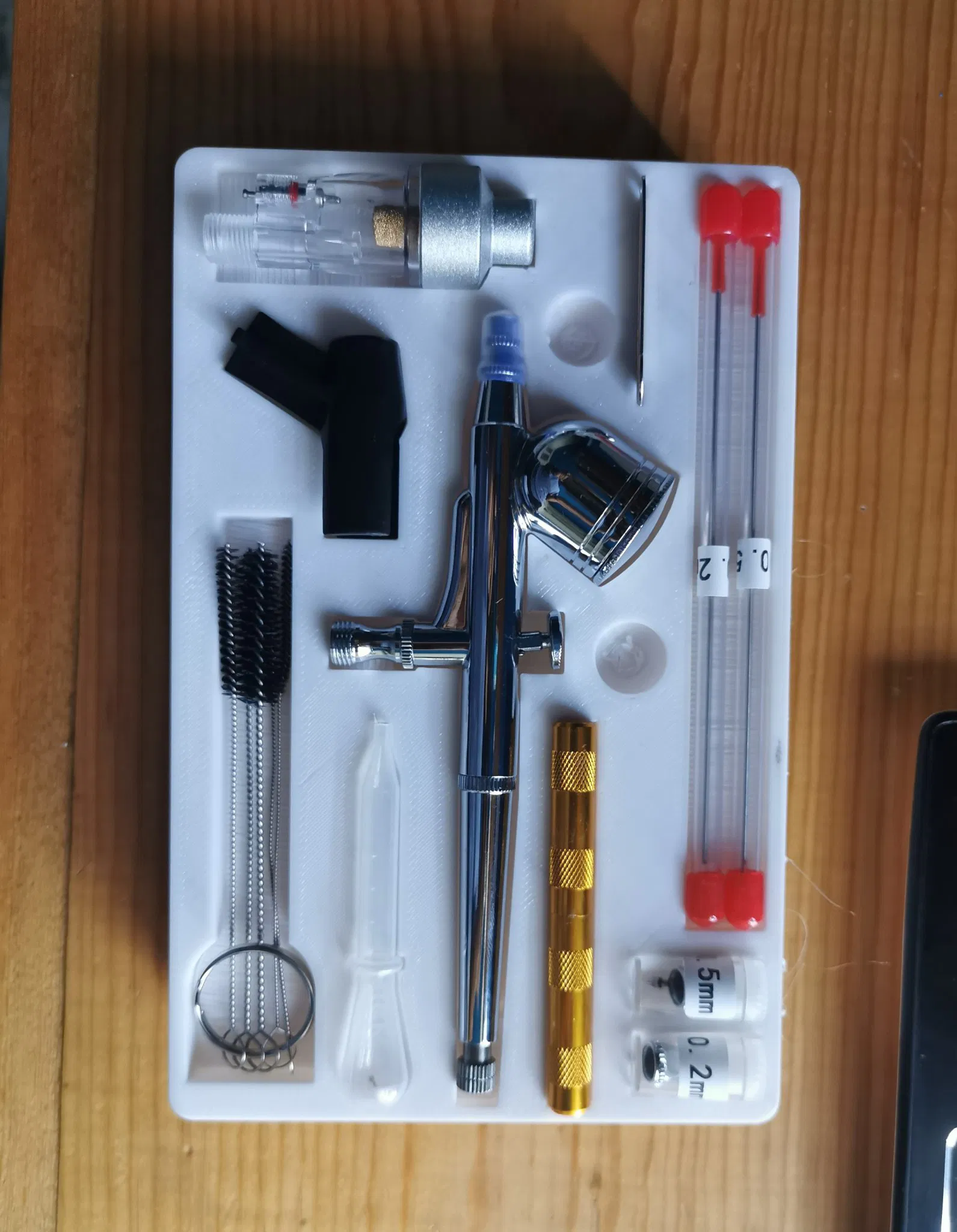 Tôi không thích cách mà nhiều bộ phận được đóng gói trong các túi khác nhau với bộ dụng cụ phun sơn của mình, vì vậy tôi đã thiết kế một khay tổ chức nhanh mà vừa với hộp mà nó đi kèm.