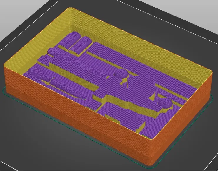 In ở độ cao lớp 0,2mm lên đến 14mm để có được các phần nhô ra tốt hơn, phần còn lại được in ở độ cao lớp 0,4mm để tiết kiệm thời gian.