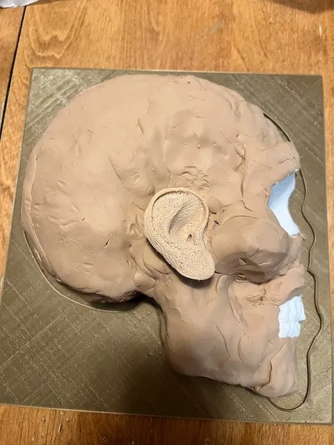 Có chỗ giữa hộp sọ và não cho một túi “máu.” Và chỉ cần in lại phần chèn xương nhỏ hơn mỗi lần. Sử dụng một tấm silicone hoặc đất sét mô hình cho “da” và “mô mềm.” Một vết rạch được thực hiện vào da bằng dao phẫu thuật, và sau đó lỗ được khoan cẩn thận vào xương, trong khi tránh cẩn thận não bên dưới. Tôi đã bao gồm một mô hình của một cái tai như một mốc giải phẫu tùy chọn để giúp hướng dẫn vị trí rạch.