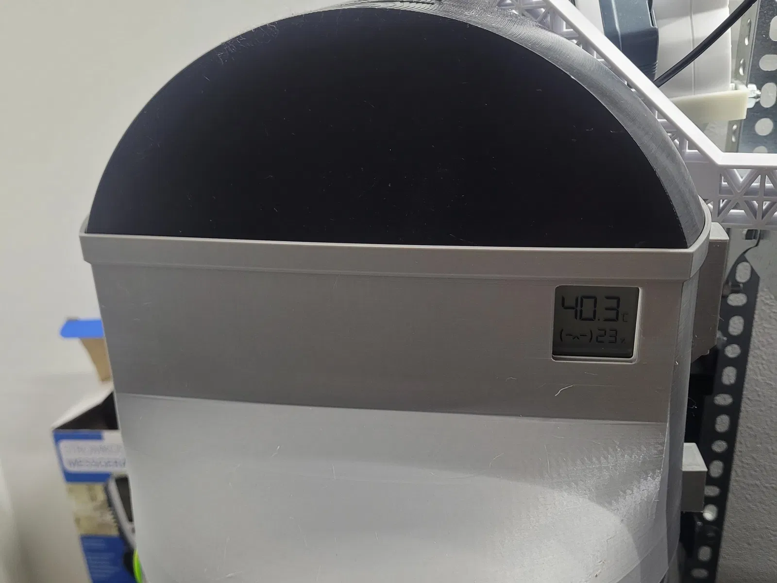 Đây là một bộ chuyển đổi cho máy sấy thực phẩm để cho phép nó làm khô sợi trong khi in. Nó tương thích với <> vì vậy có thể có một sợi đang được làm khô ở dưới trong khi một cuộn khác ở trên đang cuộn vào máy in bằng cách xếp chồng chúng lại với nhau (xin xem hình ảnh). Tôi đã sử dụng cái này với Sencor SFD 790WH. Khi nhiệt độ được đặt ở 55°C với núm điều chỉnh, phần trên của vỏ đo khoảng 43-44°C, điều này thật hoàn hảo. Máy sấy thực phẩm này có thể làm khô PETG cũng như có thể có không khí 60°C (nếu núm nhiệt độ được đặt ở mức tối đa). Tôi đã sử dụng cảm biến nhiệt độ Xiaomi 2. ### In ấn Tôi khuyên bạn nên in cái này (và con lăn) bằng PETG hoặc bất kỳ vật liệu nào có nhiệt độ thủy tinh khá cao, vì PLA bị biến dạng. (Hình ảnh sử dụng PETG và nó hoạt động hoàn hảo). Tôi đã in cái này trên một Ender 3 (bảng xây dựng 235x235), tất cả các phần cần được đặt chéo. Tôi đã phải sử dụng brims với các phần bên phải, bên trái và nắp vì tôi đã gặp một số biến dạng với PETG. Về cơ bản, phần bên trái có thể được in mà không cần hỗ trợ, nhưng ở bên phải, vị trí cảm biến nhiệt độ cần hỗ trợ (tôi đã sử dụng plugin hỗ trợ tùy chỉnh của eSlicer cho điều đó) và trên nắp, phần giữa cũng cần hỗ trợ (trừ khi máy in được điều chỉnh sao cho có thể cầu nối khoảng 20cm, trong trường hợp đó in ở bên có thể tốt hơn và có thể tránh được hỗ trợ cho nắp). Tôi khuyên bạn nên có 3-5 lớp tường để có một phần mạnh và đặt độ đầy là 0% (một chút không khí giữa các tường có thể giúp với việc cách nhiệt). In 2 cái TopLockPin và BottomLockPin và một cái từ mỗi phần còn lại. Tôi cũng đã thêm tệp lưu trữ tham số Fusion 360 nếu ai đó muốn chỉnh sửa nó. ### Lắp ráp và BoM - Vòng bi 2x608zz (có thể sử dụng mà không cần vòng bi, nhưng ma sát sẽ tốt hơn với một vòng bi đúng cách)