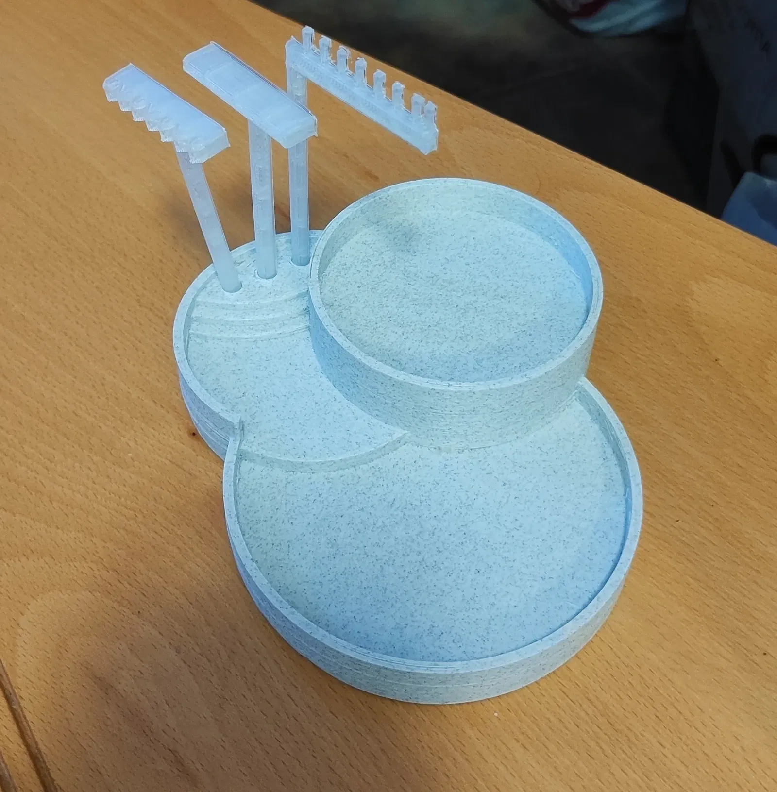 Vì vậy, tôi đã thấy một mô hình khác (https://www.f3d.vn/3d-model/58084-bo-dung-cu-tao-vuon-zen-nghe-thuat) và nó đã truyền cảm hứng cho tôi tạo ra một bản in đơn giản hơn mà không có các phần nhô ra và cầu. Vì vậy, tôi đã thiết kế lại từ đầu. Và sau đó tôi không thể cưỡng lại việc tạo ra chỗ để chứa các cái cào, vì vậy tôi cũng đã thiết kế chúng để vừa vặn. Đây là một bản in khá dễ dàng nên bạn có thể tăng tốc độ in lên. Các cái cào in tốt nhất với viền, hãy thoải mái in tất cả cùng nhau nếu bạn tin tưởng máy in của mình hơn tôi.