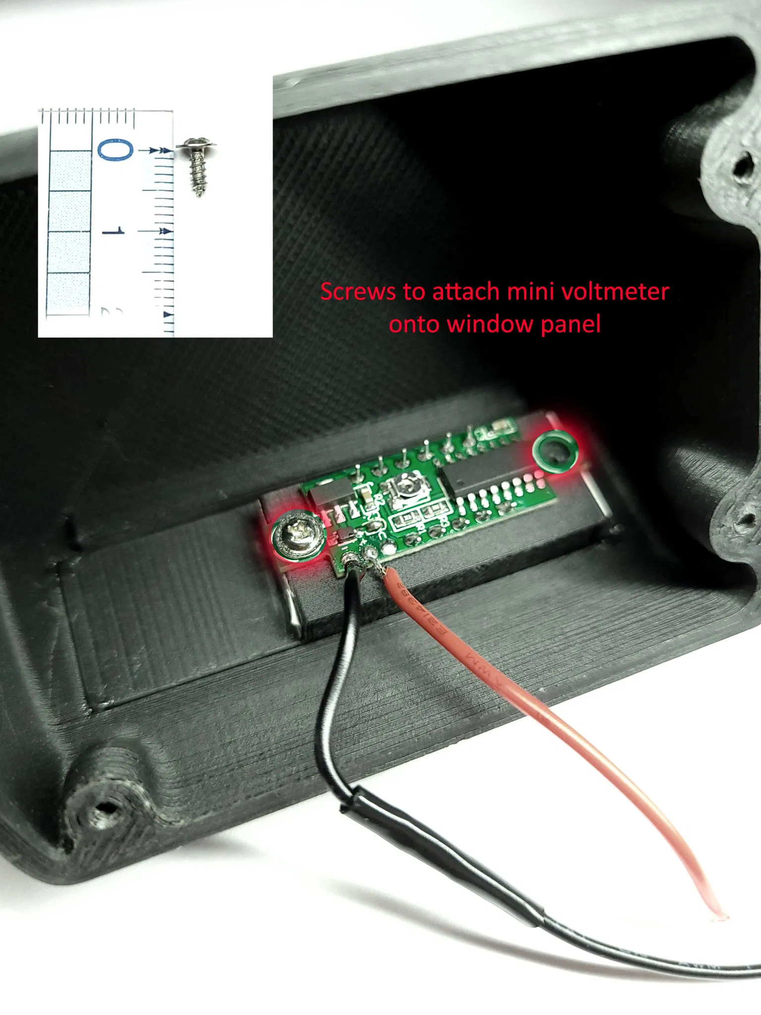 - Vặn đồng hồ đo điện áp mini vào bảng cửa sổ. Thực sự thì phần này rất dễ vỡ. Những lần đầu tiên tôi cố gắng vặn nó vào thực sự đã làm vỡ phần đó nên tôi chỉ giữ lại 1 trong 2 con vít.
