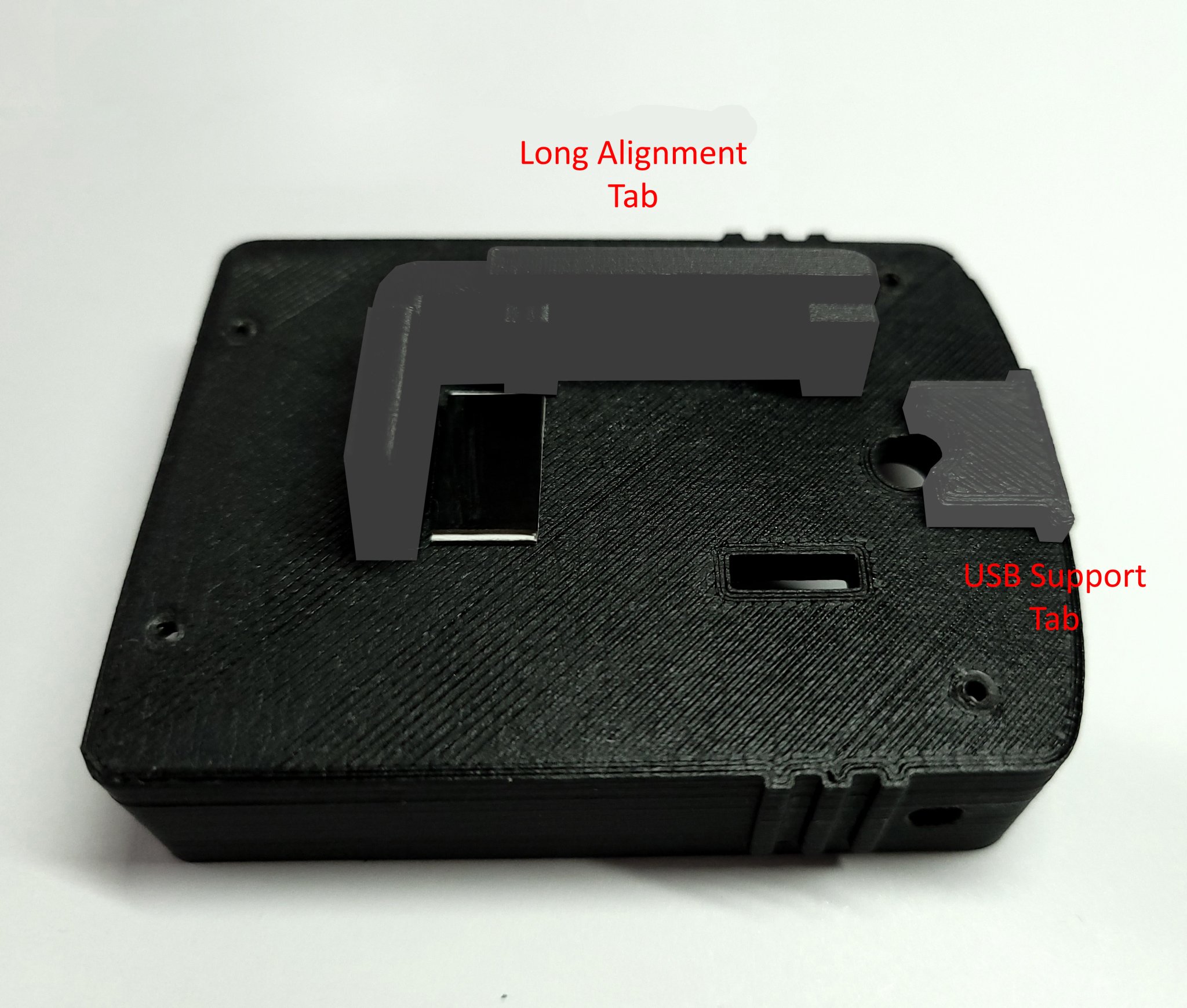 2. Chèn chấu căn chỉnh dài và chấu hỗ trợ cho mặt dưới của cổng USB-a. Dẫn các dây từ đầu nối và giữ chúng gần chấu hỗ trợ. Sử dụng không gian nhỏ phía sau cổng usb-a.