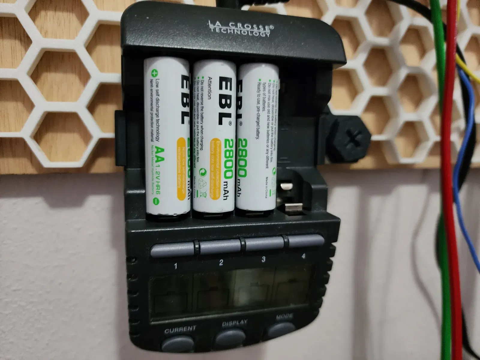 Đây là một khung để giữ bộ sạc pin BC-1000 với các lỗ của quầy được đặt cách nhau để phù hợp với bức tường lưu trữ tổ ong.