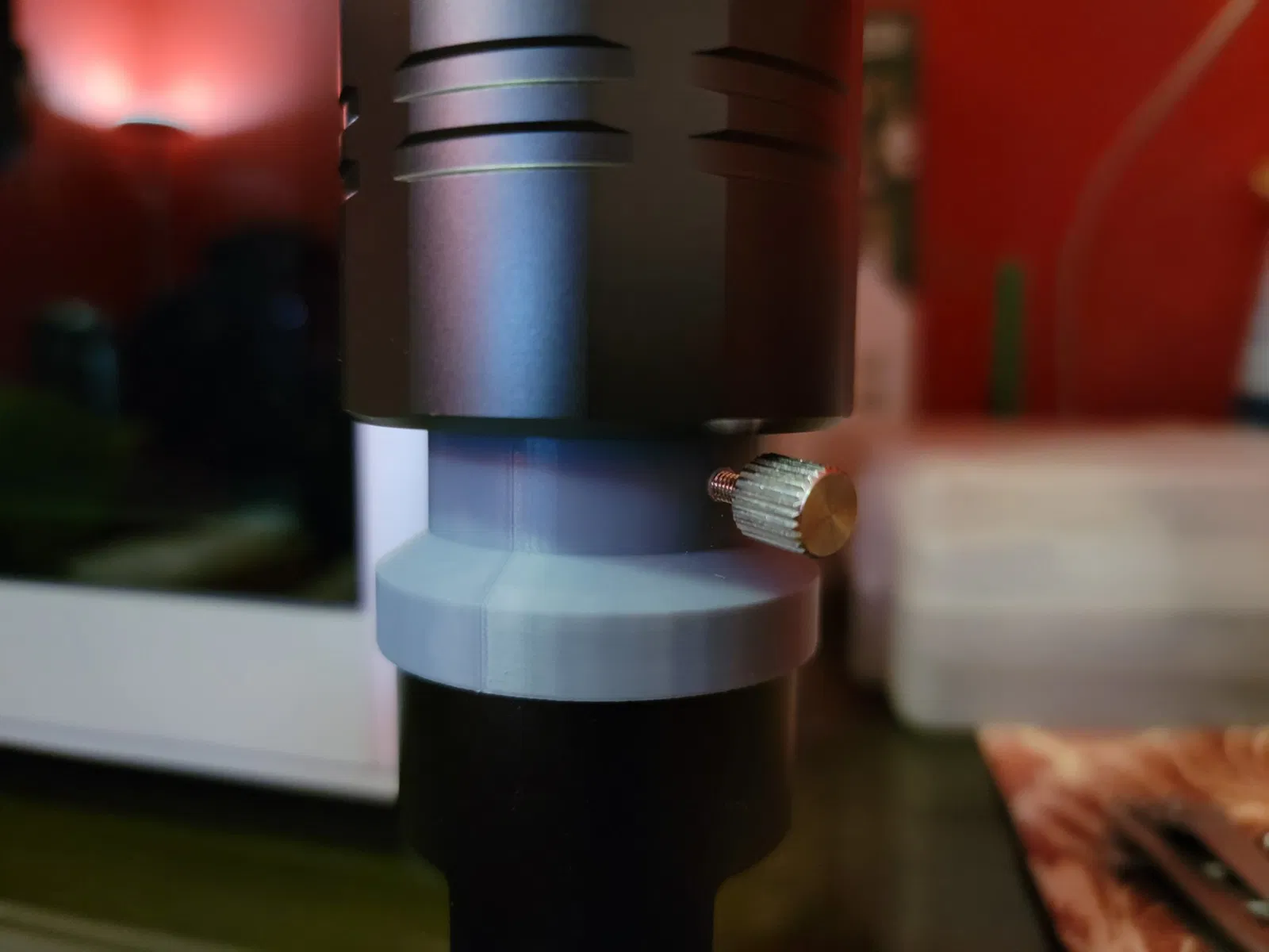 Không có vít khóa nhưng có thể thêm vào. Ngoài ra, phần mở rộng 1.25 in có thể được làm dài hơn nếu cần. Vít vào rất tốt với phần ống kim loại. Sử dụng khoan 2.5mm, tôi đã khoan vào phần 1.25 để thêm một vít khóa từ một giá đỡ kính mắt cũ mà tôi có thừa.