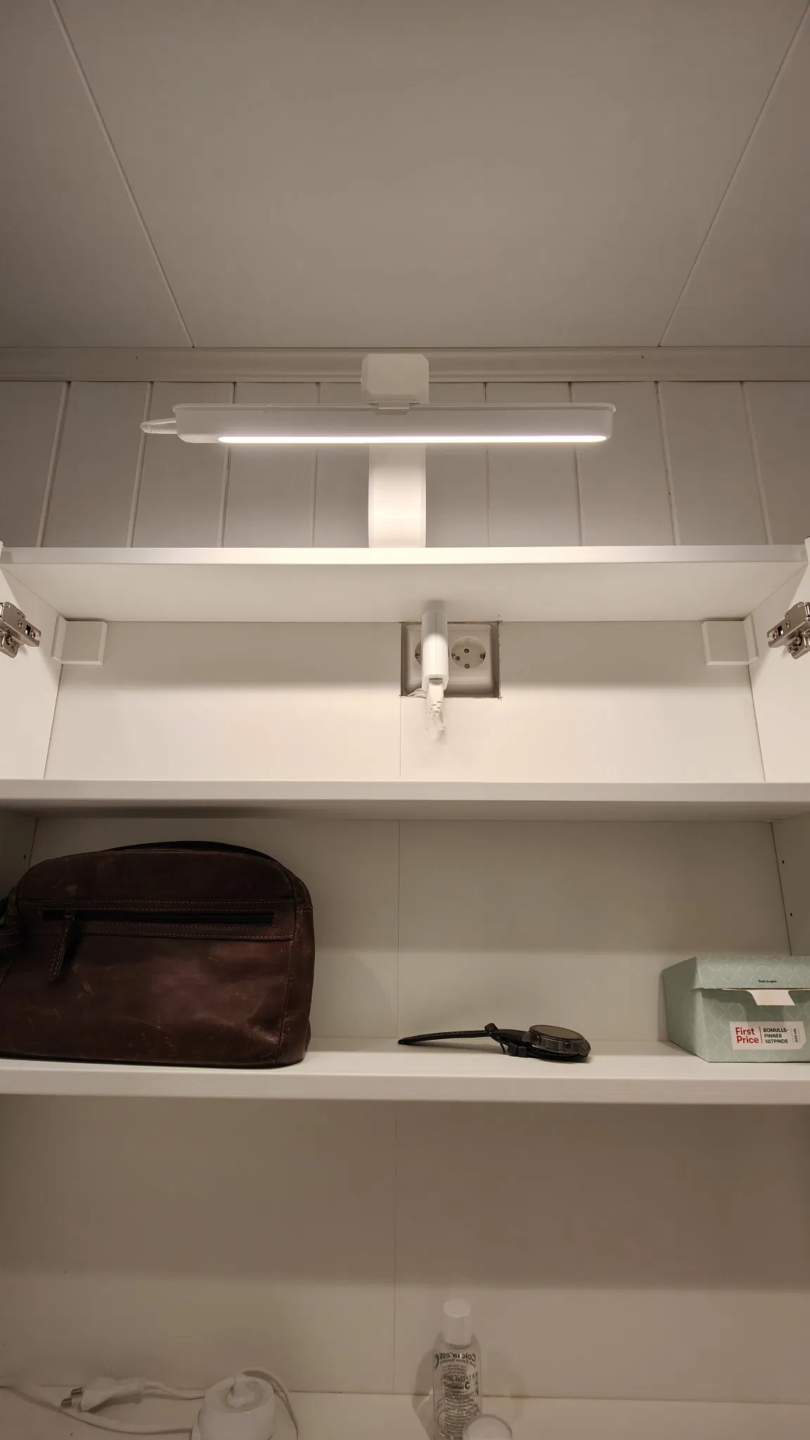 Gắn đèn LED IKEA Rolfstorp lên trên một cái tủ. Tôi đã chọn góc sao cho ánh sáng hoạt động như một ánh sáng khuôn mặt khi cửa gương của tôi đóng lại cũng như chiếu sáng các kệ khi cửa mở ra. Tôi đã chạy dây điện dọc theo cánh tay và áp dụng một số giọt keo siêu dính nhỏ để giữ nó ở vị trí. Ánh sáng được gắn vào cánh tay bằng một trong hai giá đỡ keo dán đi kèm. Nó có thể trượt ra nếu cần.