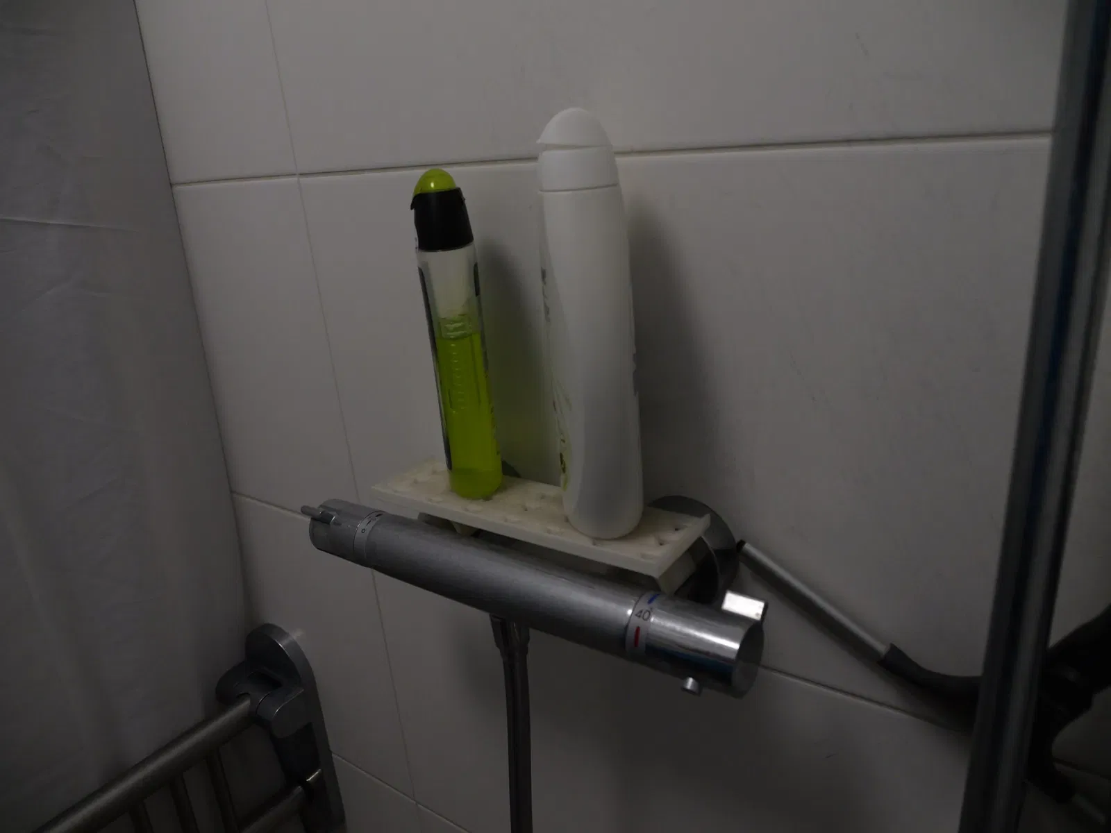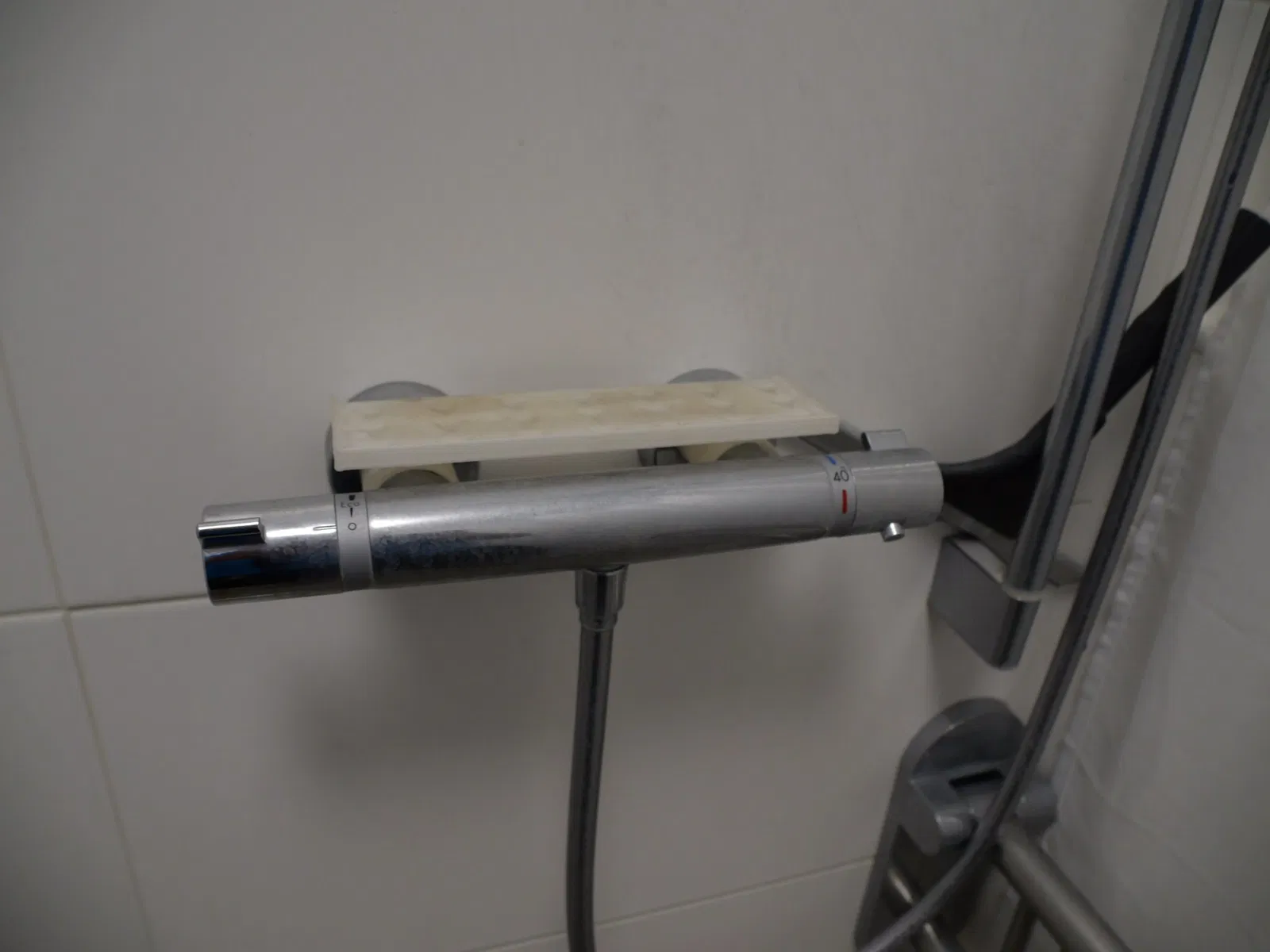 Một cái bàn nhỏ để đặt xà phòng và dầu gội trên các đường ống đến các van