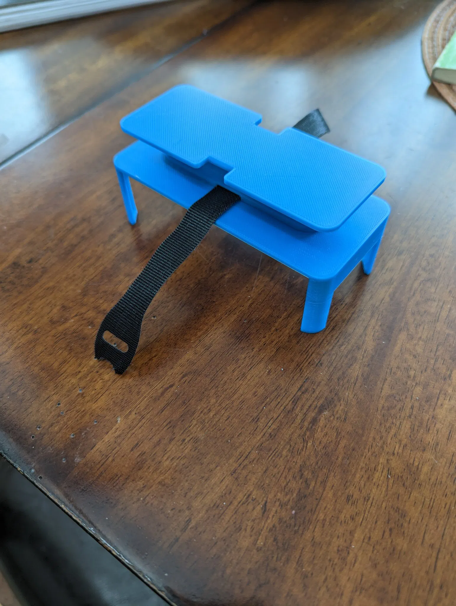 Không cần hỗ trợ. In thành 2 phần và dán chúng lại với nhau bằng keo CA. Sau khi dán, trượt một dây đai velcro qua khe giữa các phần để cố định cáp.